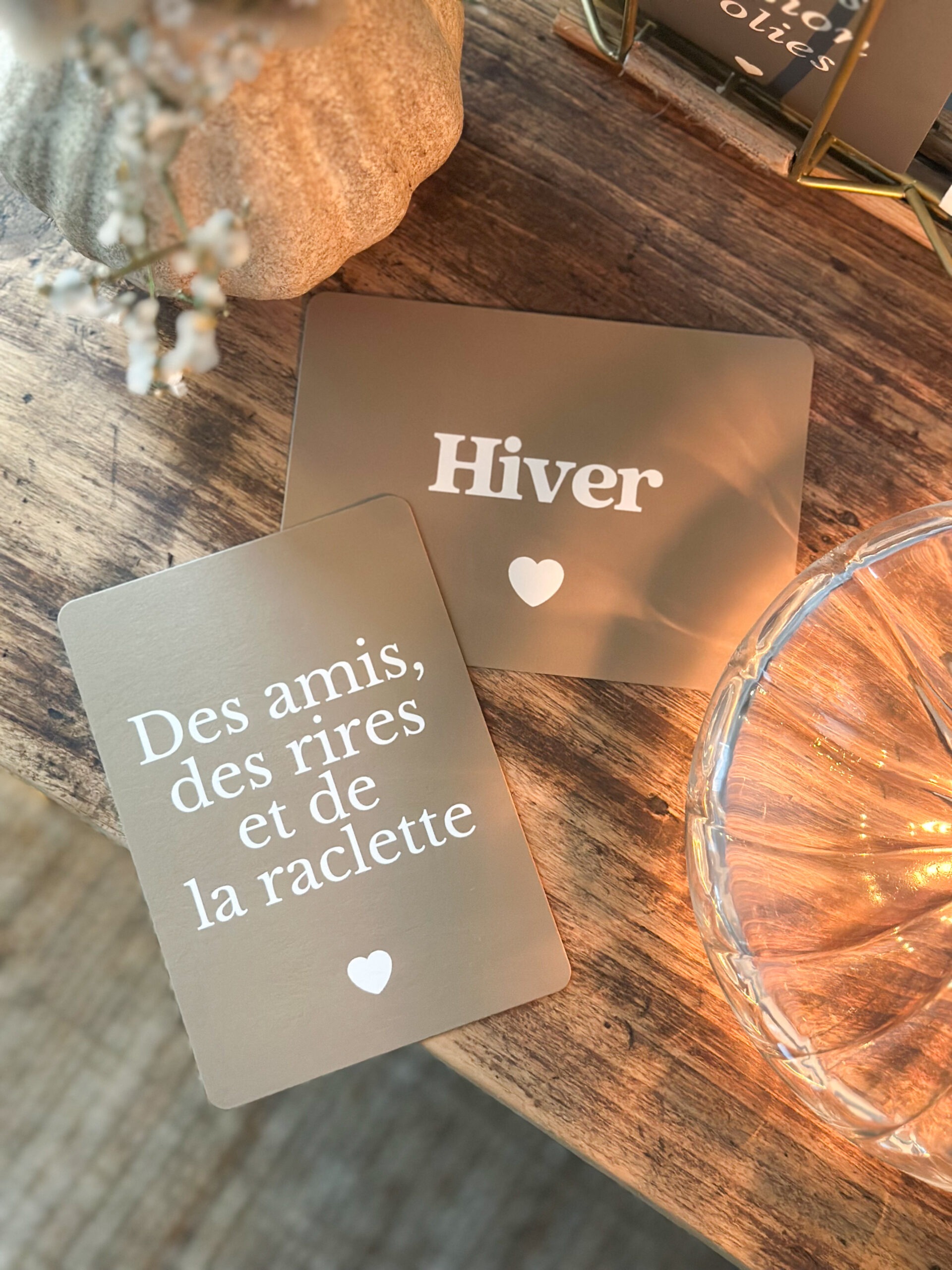 | Modèle | Love love love, Amour à la plage, Amour,désirs,passion,folies, Automne mon amour, Baisers et coquillages, Café, thé, chocolat, matcha, Ciao mi amore, Crois en toi, Des amis, des rires et de la raclette, Des rires, des amis.., Deux colombes love, Happy new year, Hiver ♡, J'aime lire le bonheur, Je t'aime plus qu'hier mais…, Joie et chaleur.., Joyeuses fêtes (noeud rouge), Joyeuses fêtes (pomme de pin), Joyeuses fêtes (sapin), L'hiver, L’amour forever, La vie est courte, Printemps,été,automne,hiver, Rallumer les étoiles, Soleil & Peau dorée, Tant qu'il y a de l'amour, Weekend cosy |