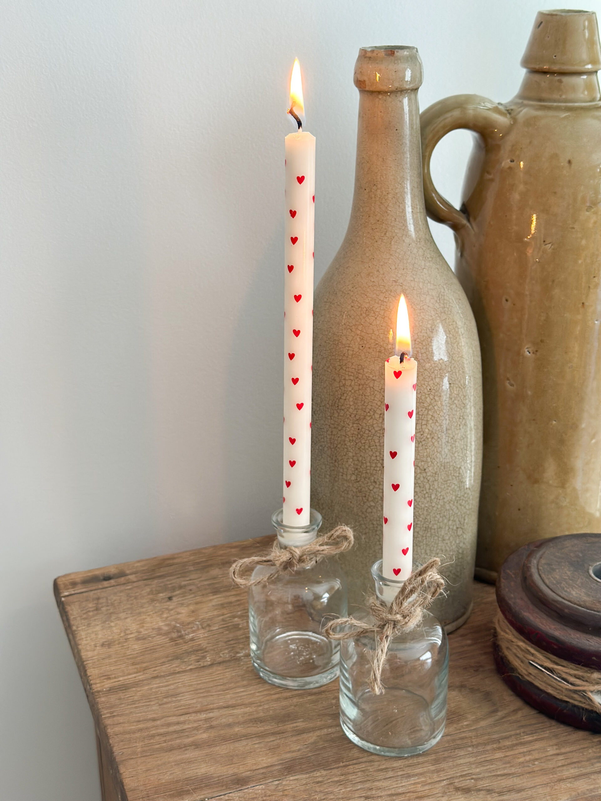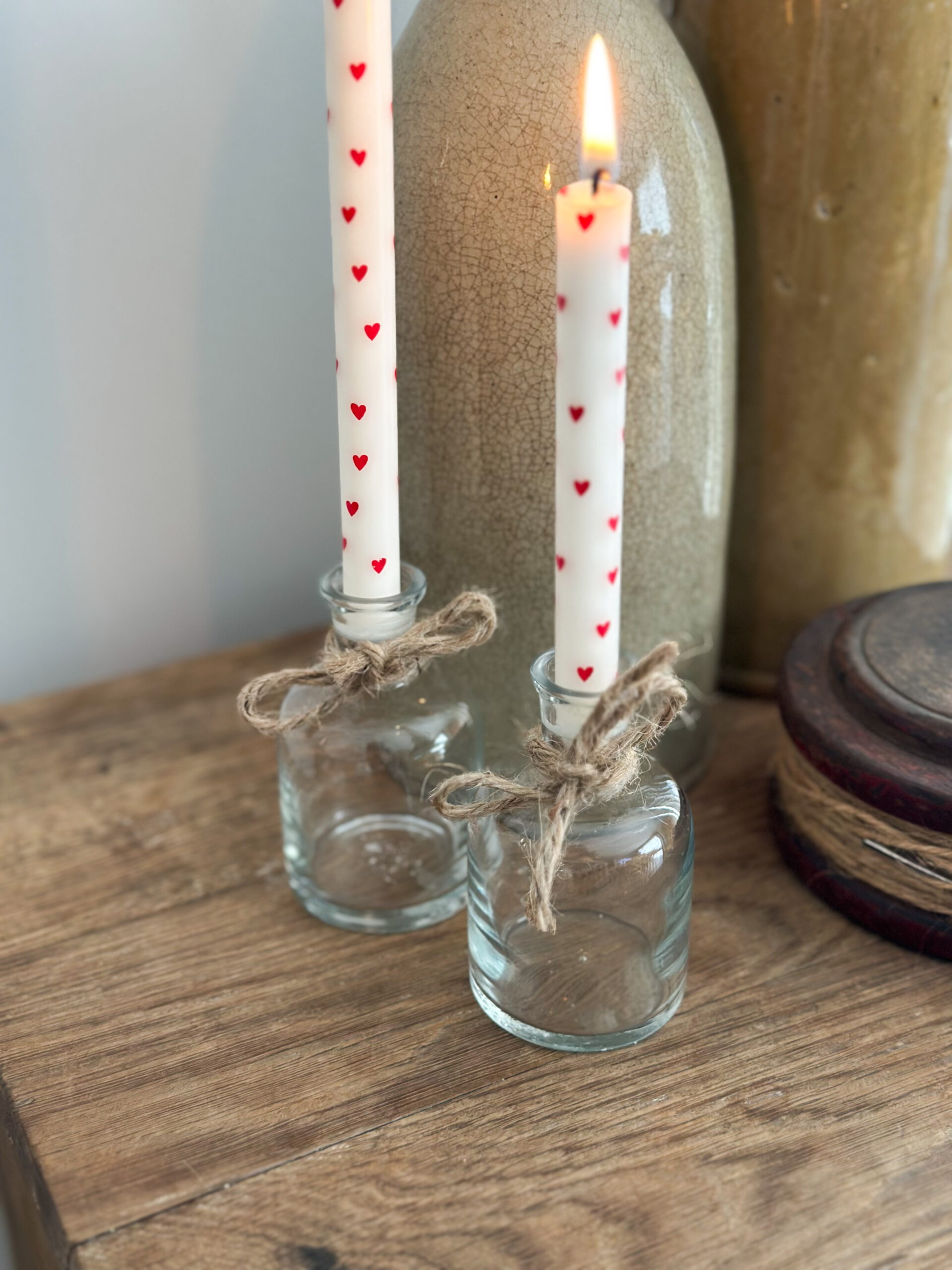 Un bougeoir inspiré du look classique des anciens flacons de pharmacie. Vous pouvez y ajouter un noeud de jute (comme sur la photo) et même des fleurs séchées à l’intérieur..