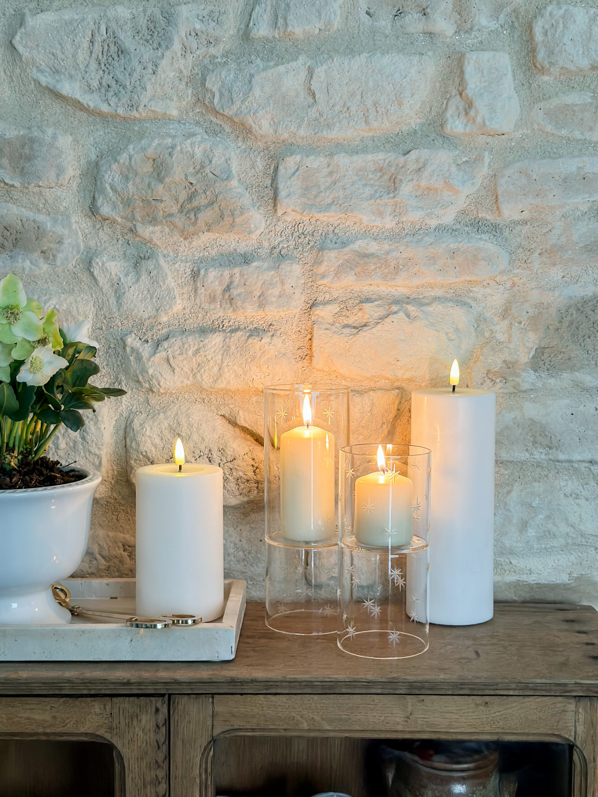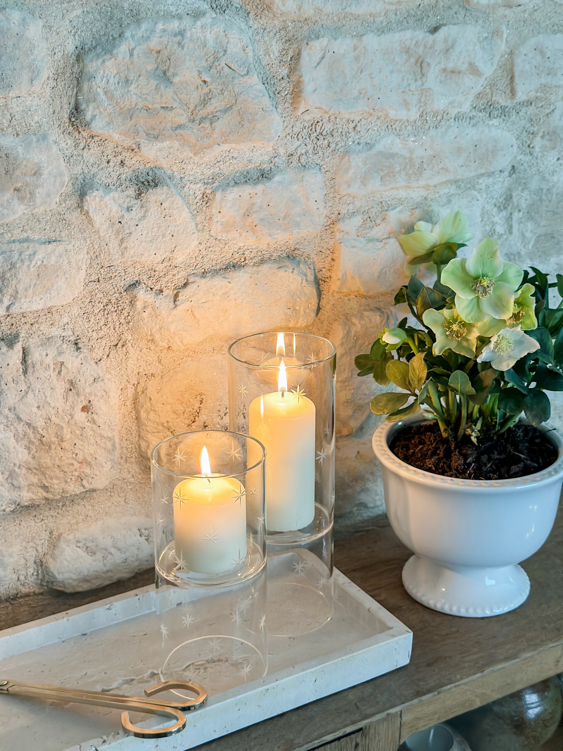 Phorophore en verre avec motif d’étoile gravé décoratif, particulièrement beau lorsqu’il est associé au modèle plus court ou groupé pour un effet de lumière époustouflant.