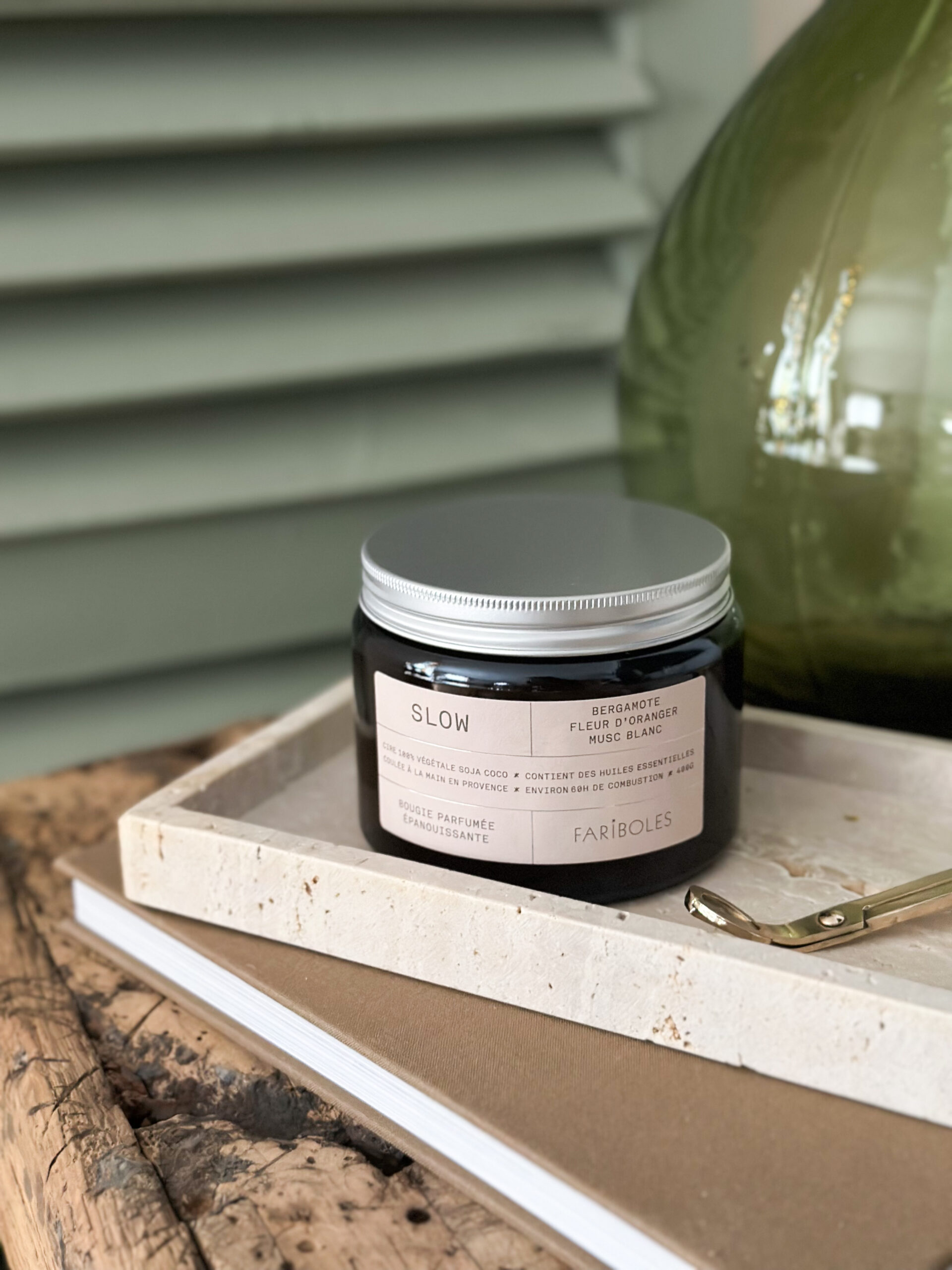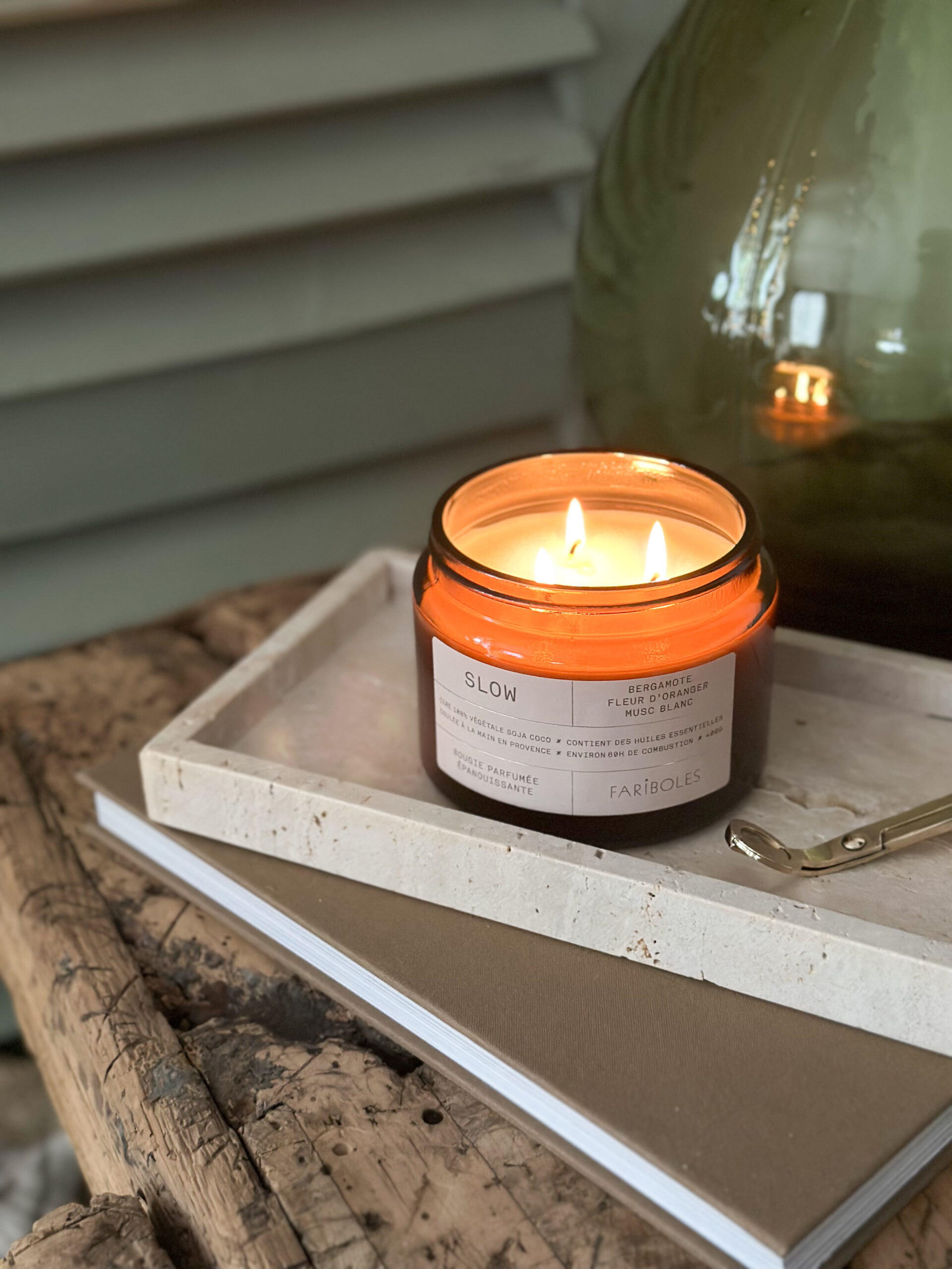 Cire 100% végétale de soja et de coco, garanties sans OGM ni pesticides. Mèche pur coton. Parfum enrichi aux huiles essentielles
