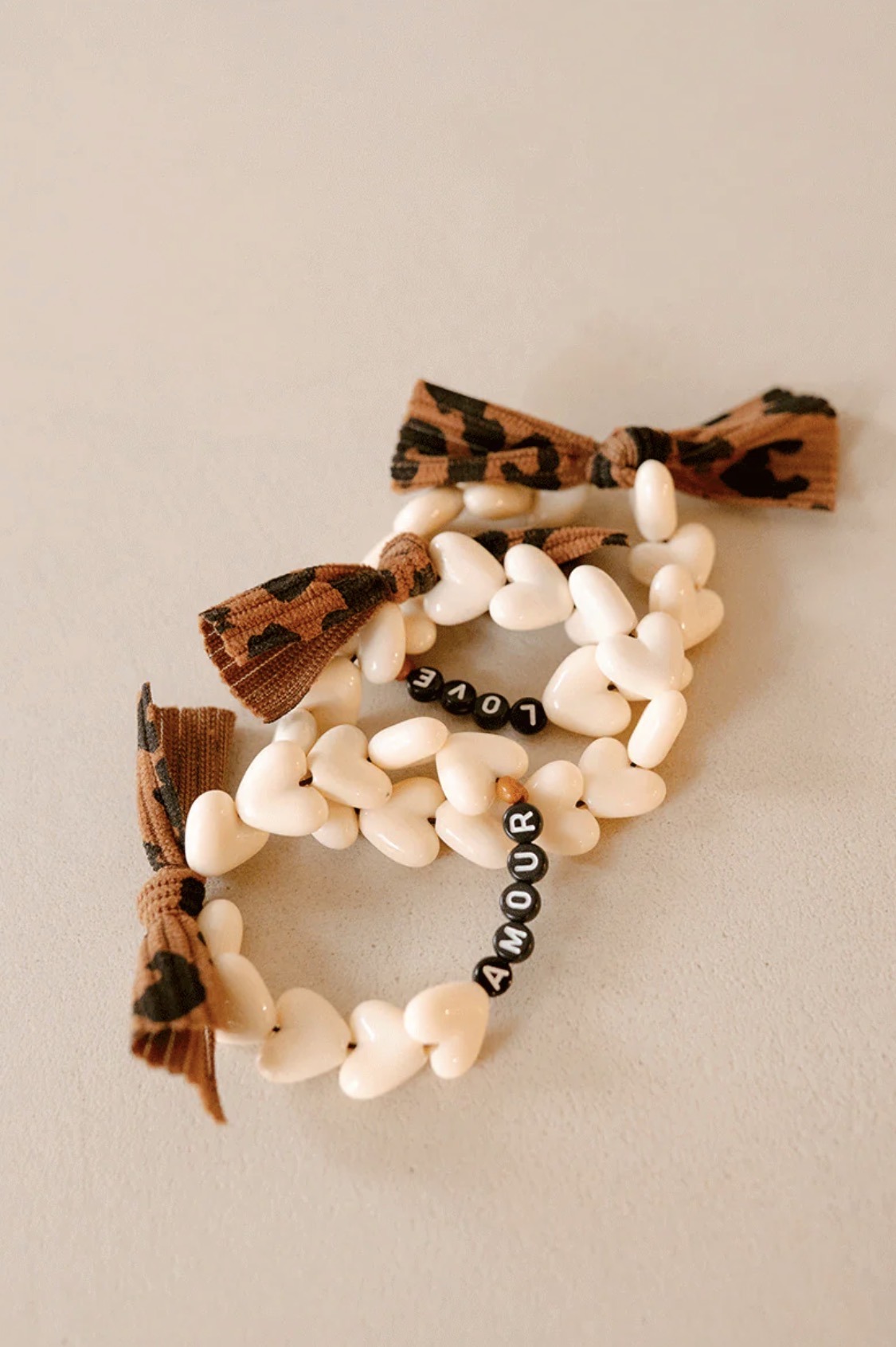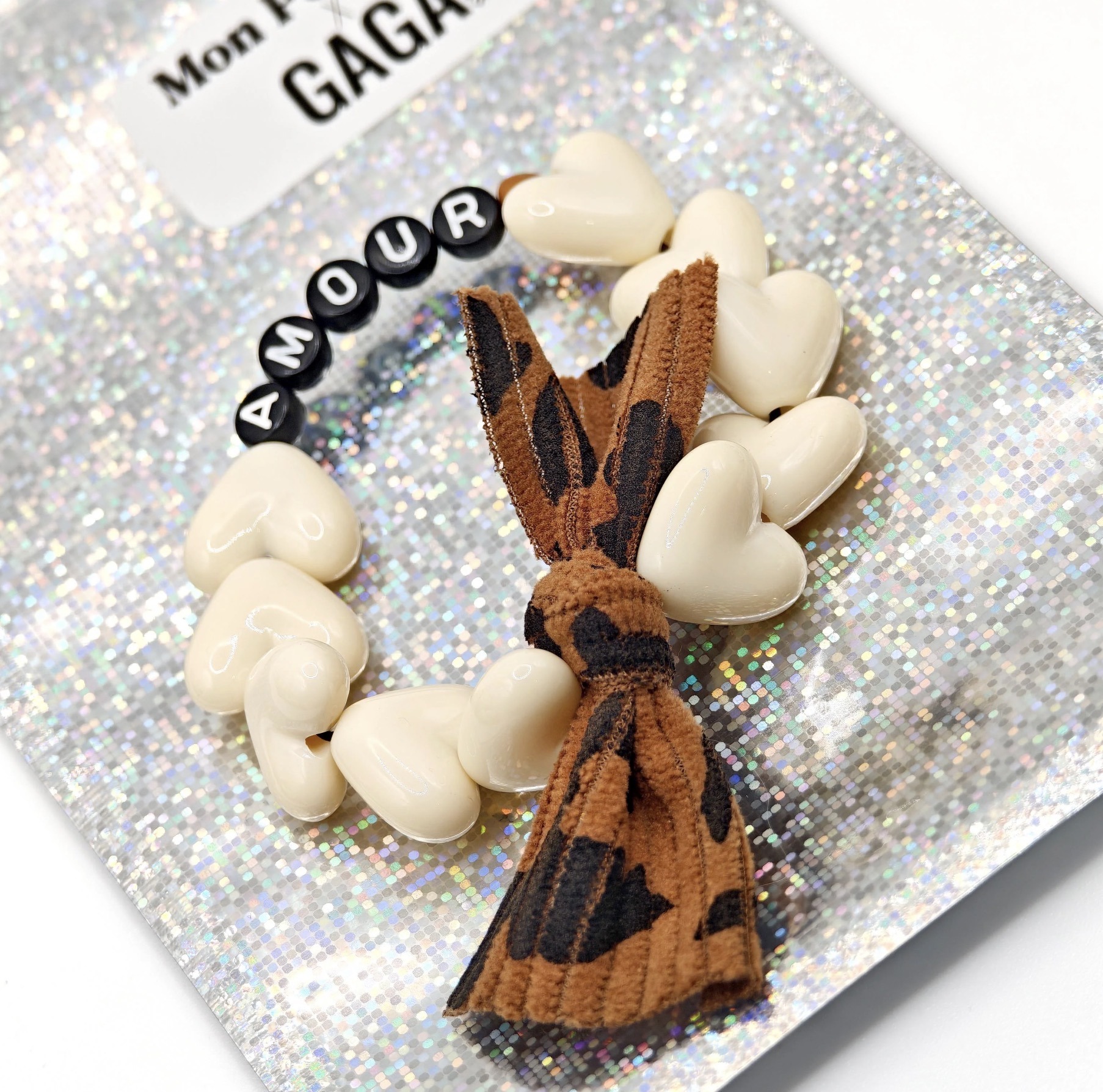 Bracelet GAGA beige avec son maxi nœud léopard / Texte AMOUR en noir.