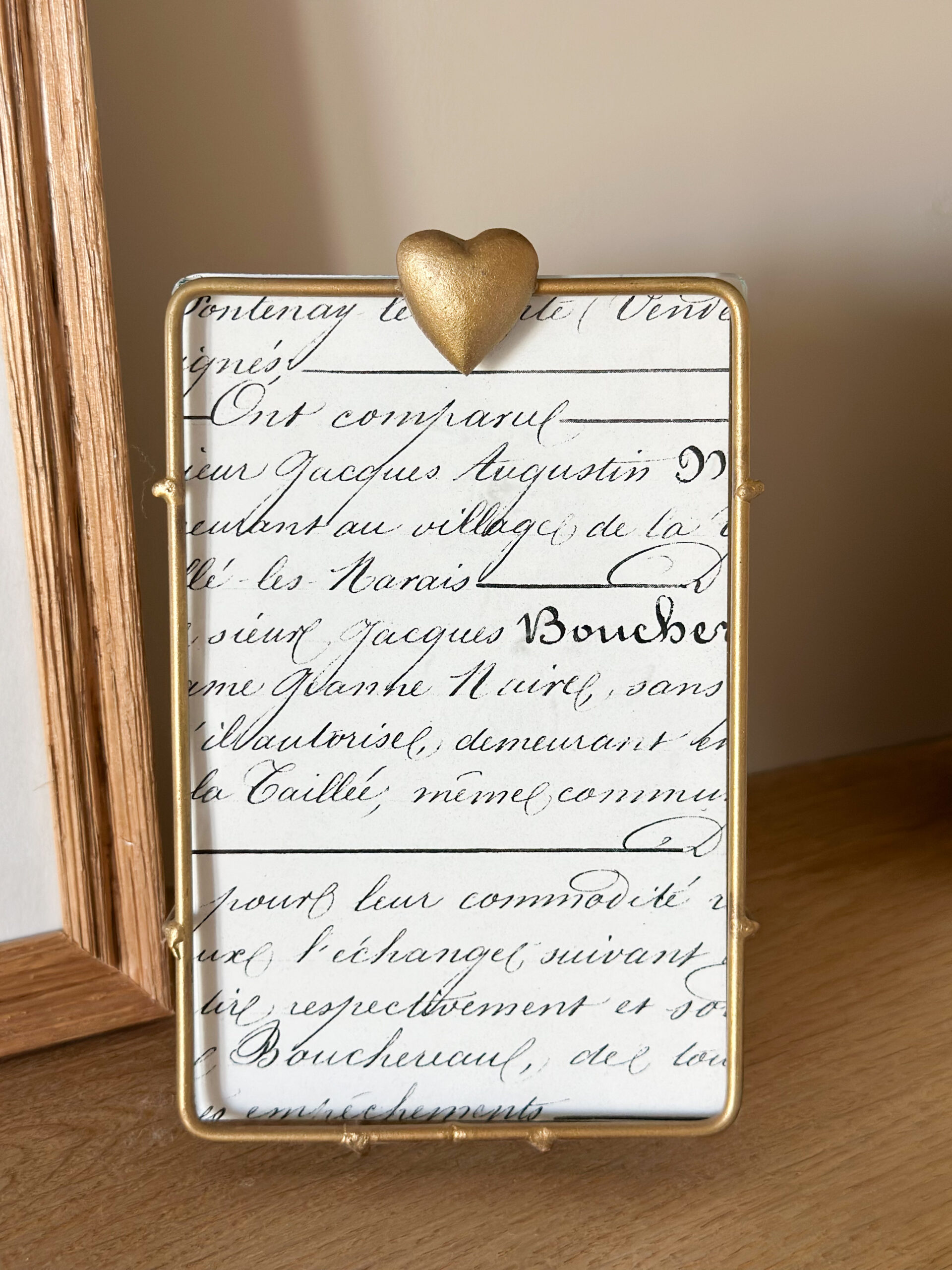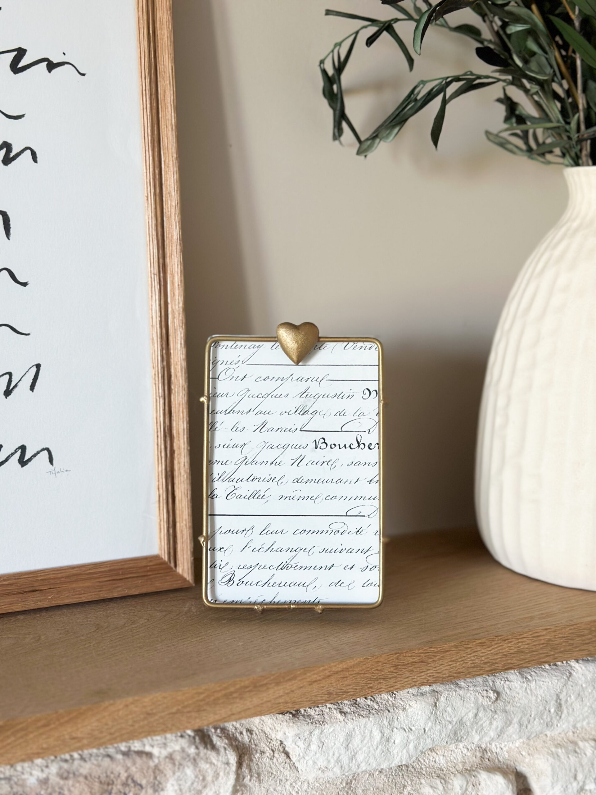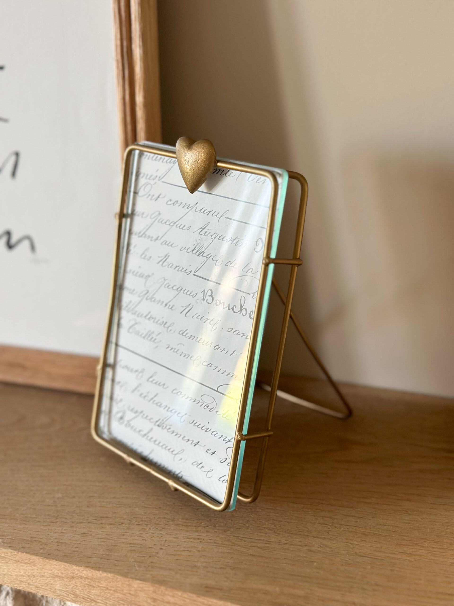 Sublimez vos souvenirs avec ce cadre photo au look romantique : métal doré et petit cœur décoratif pour une touche vintage-chic. Idéal sur une commode, une étagère ou une table de chevet, il met en valeur vos photos préférées avec élégance.