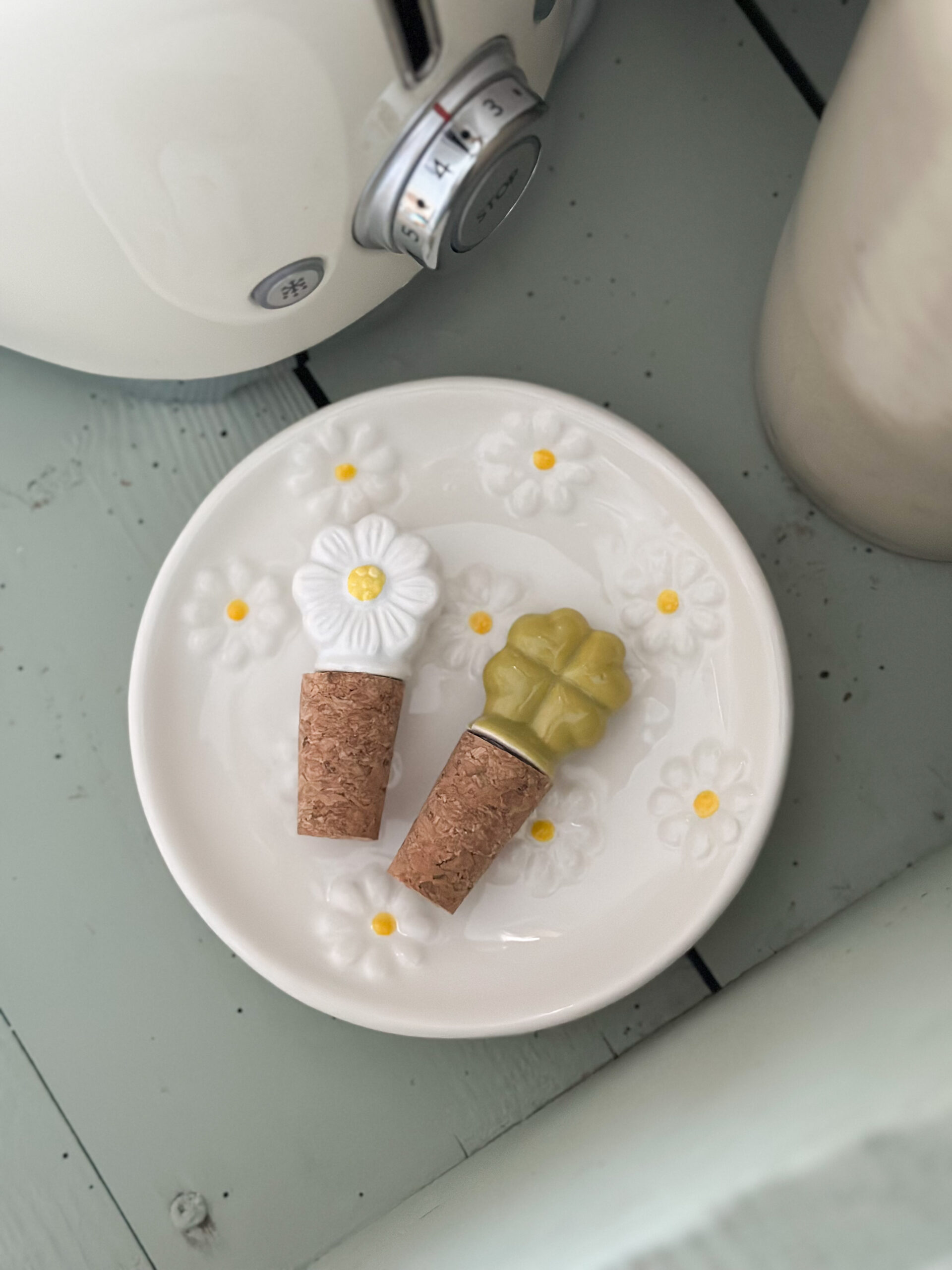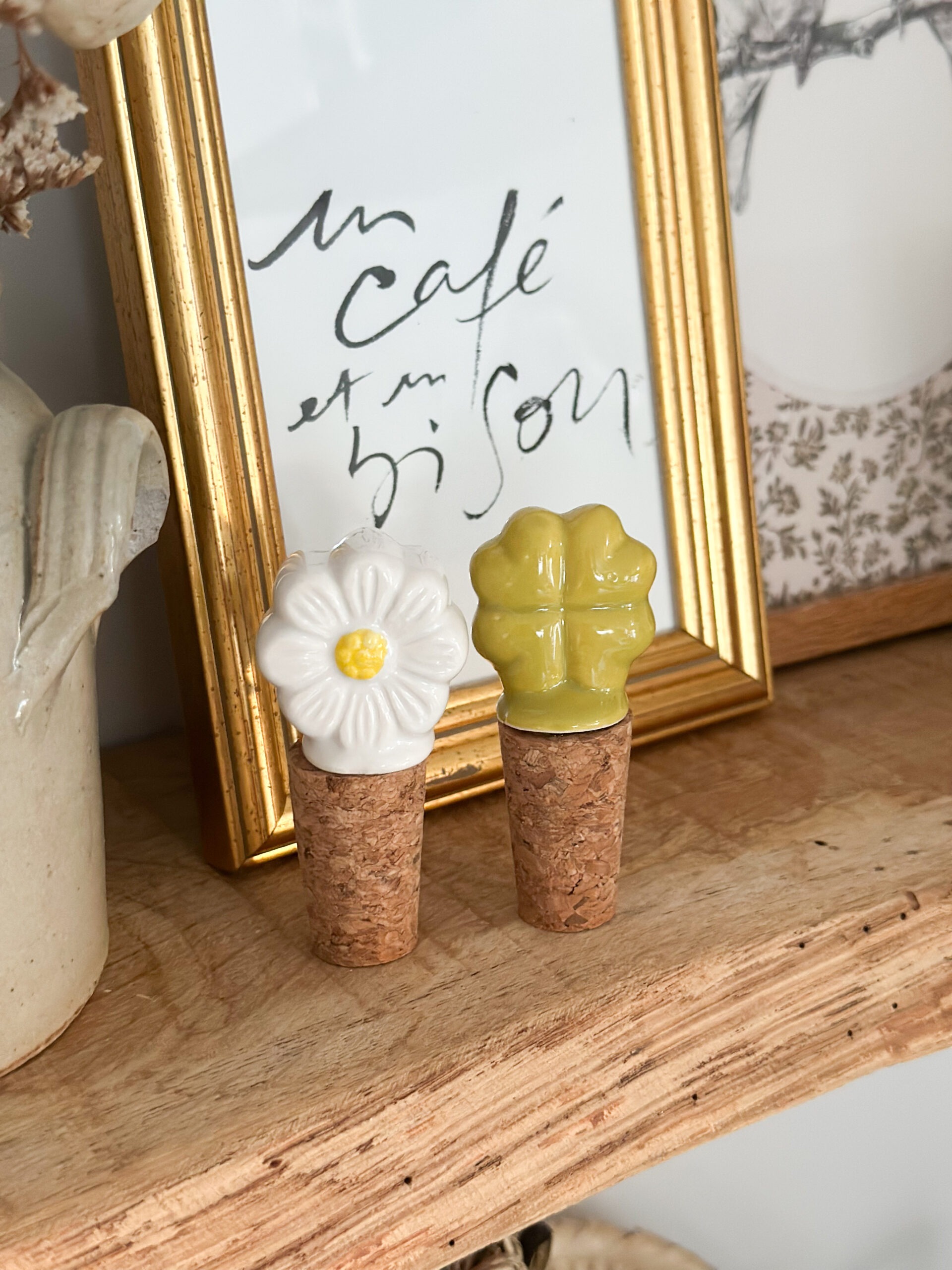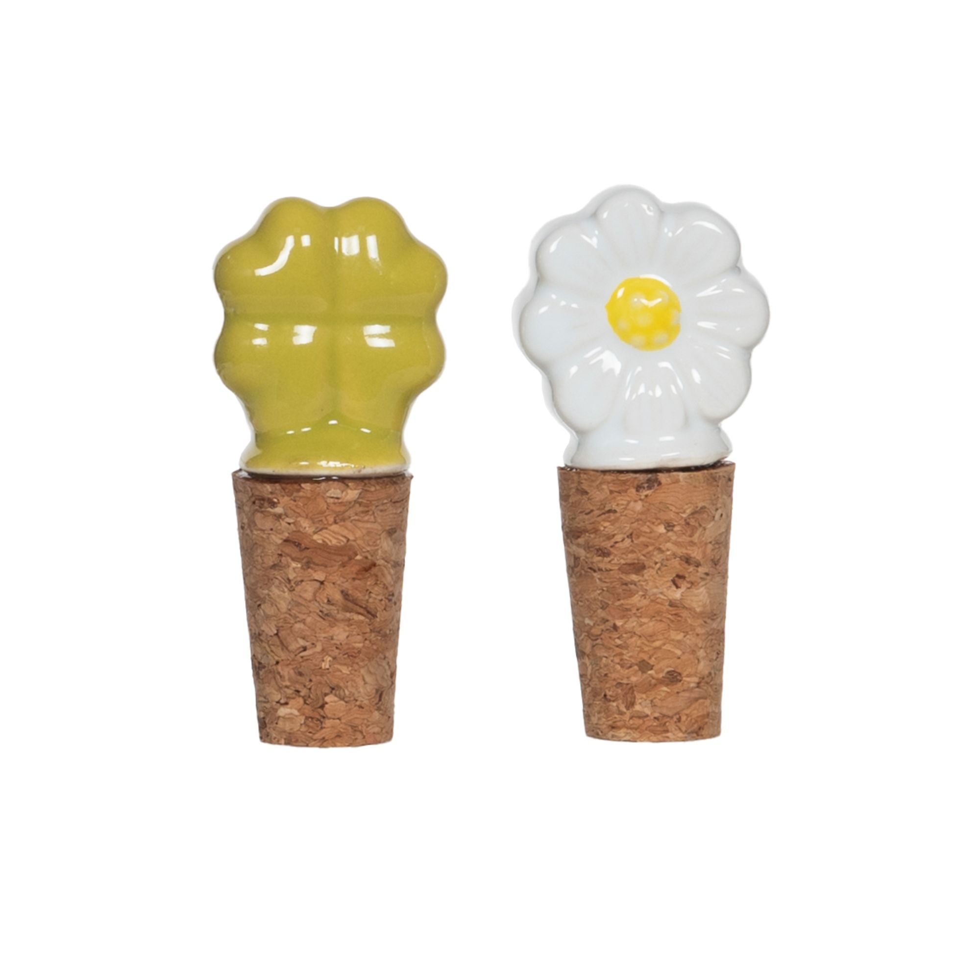 Deux bouchons décoratifs pour bouteilles au design charmant : un trèfle et une fleur blanche au cœur jaune, en céramique émaillée sur liège.
