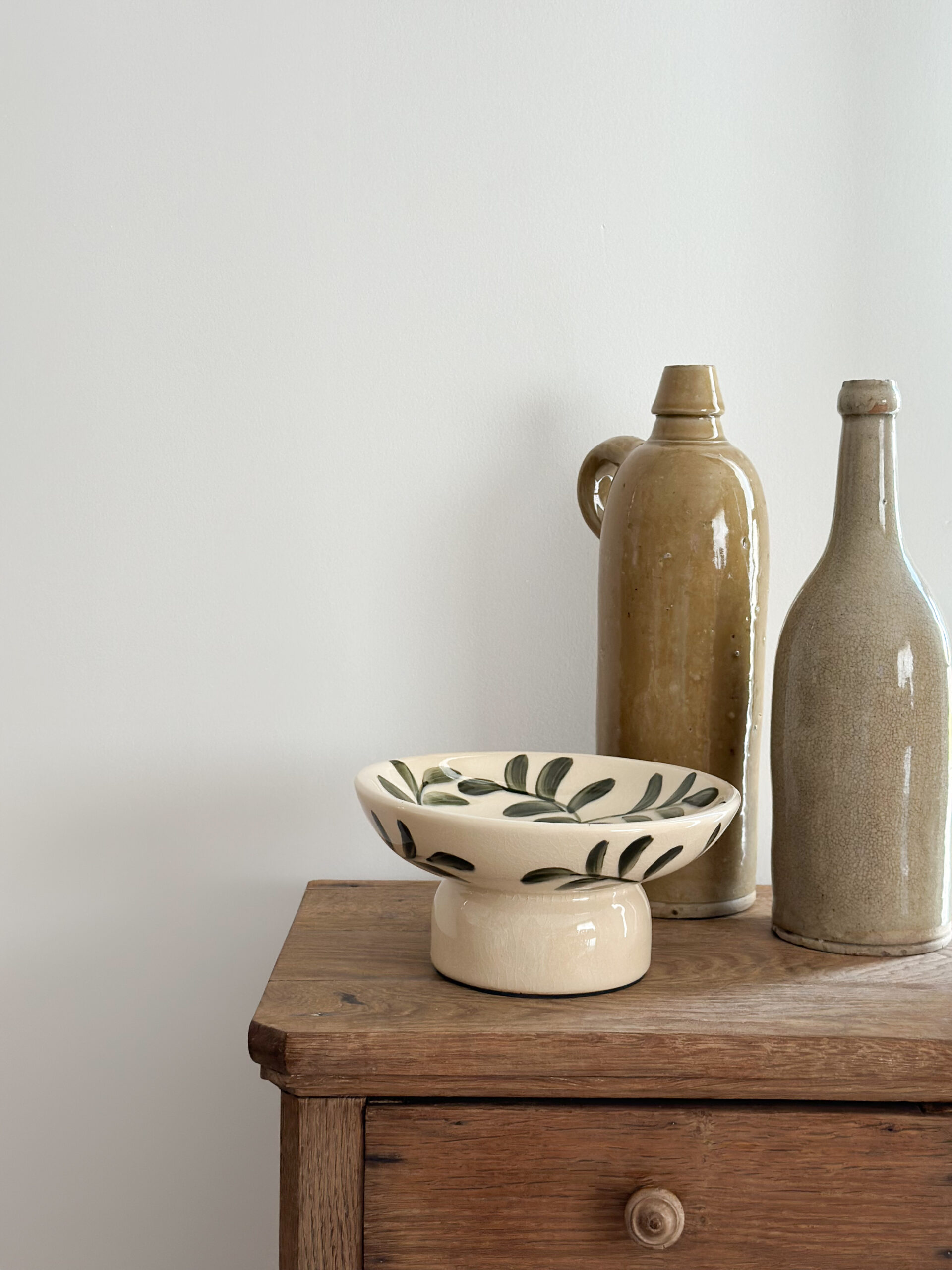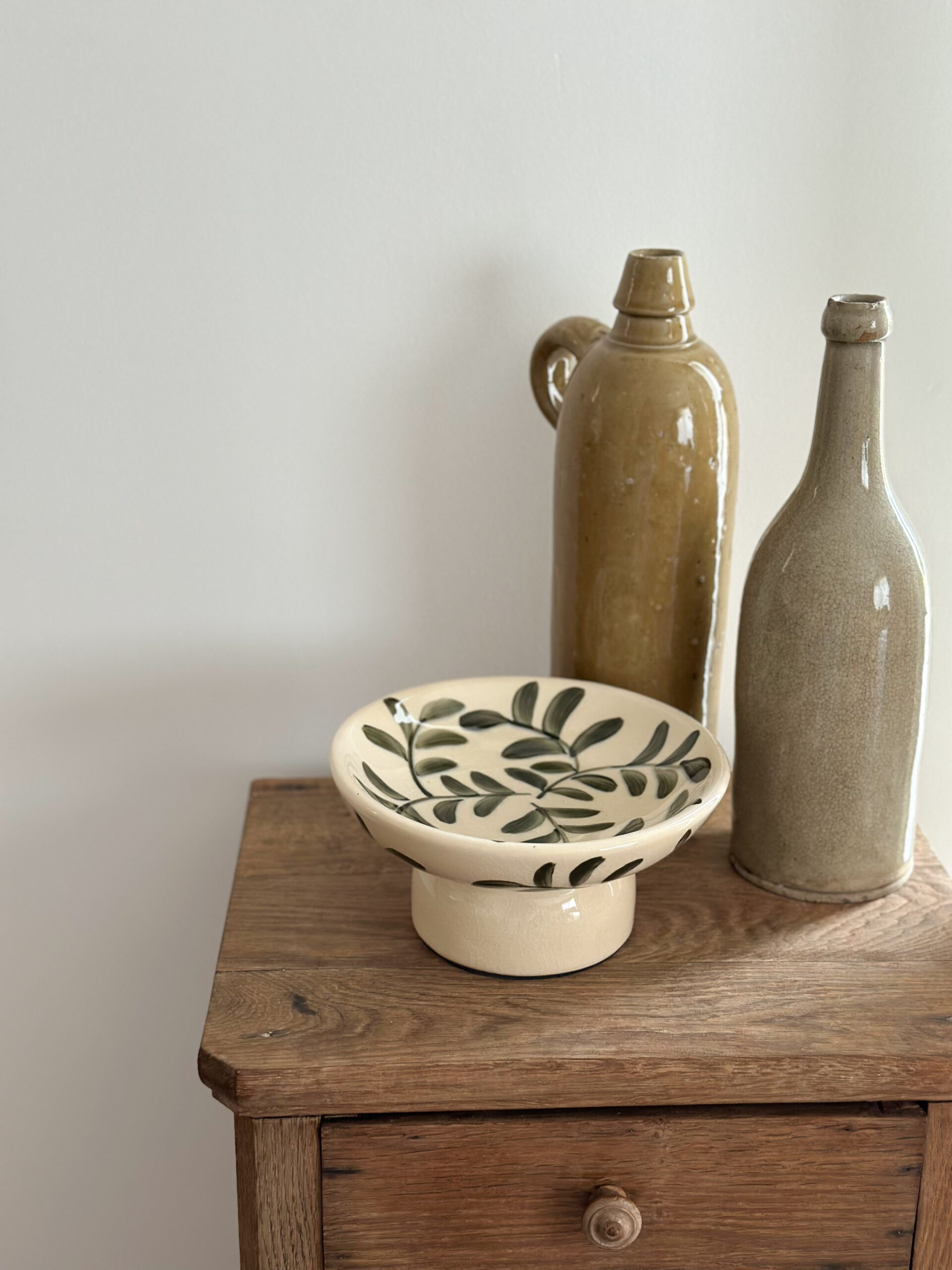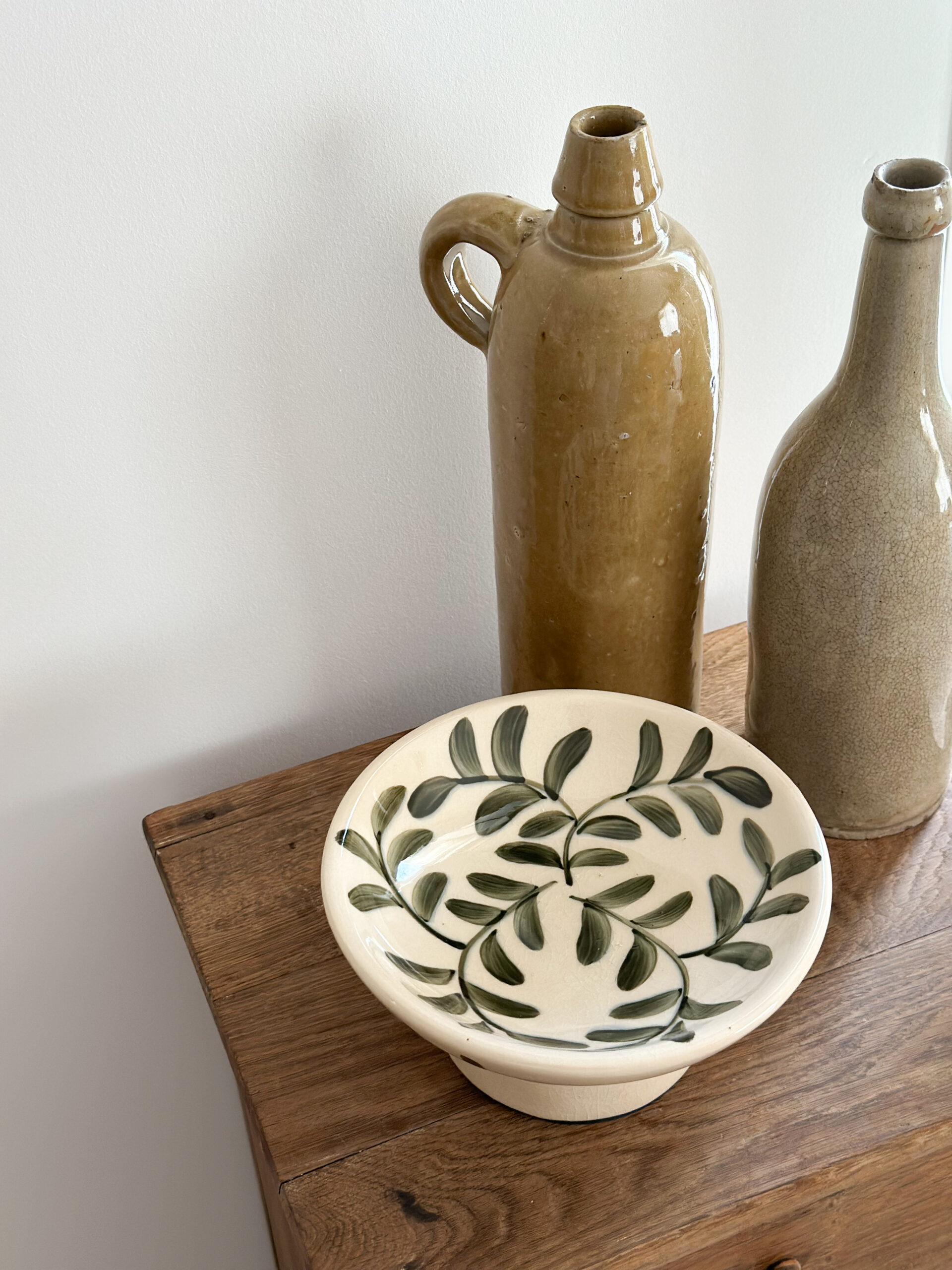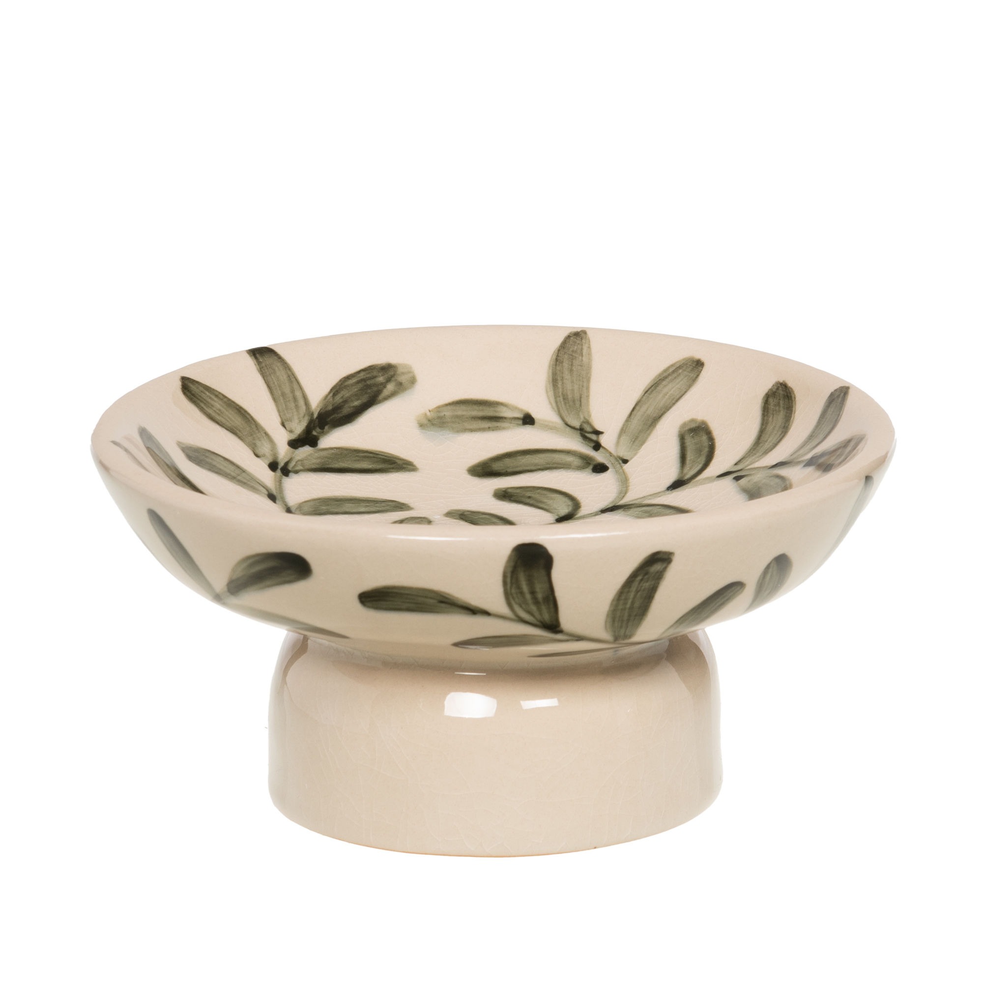 Magnifique coupe décorative en céramique beige avec un feuillage vert peint à la main.