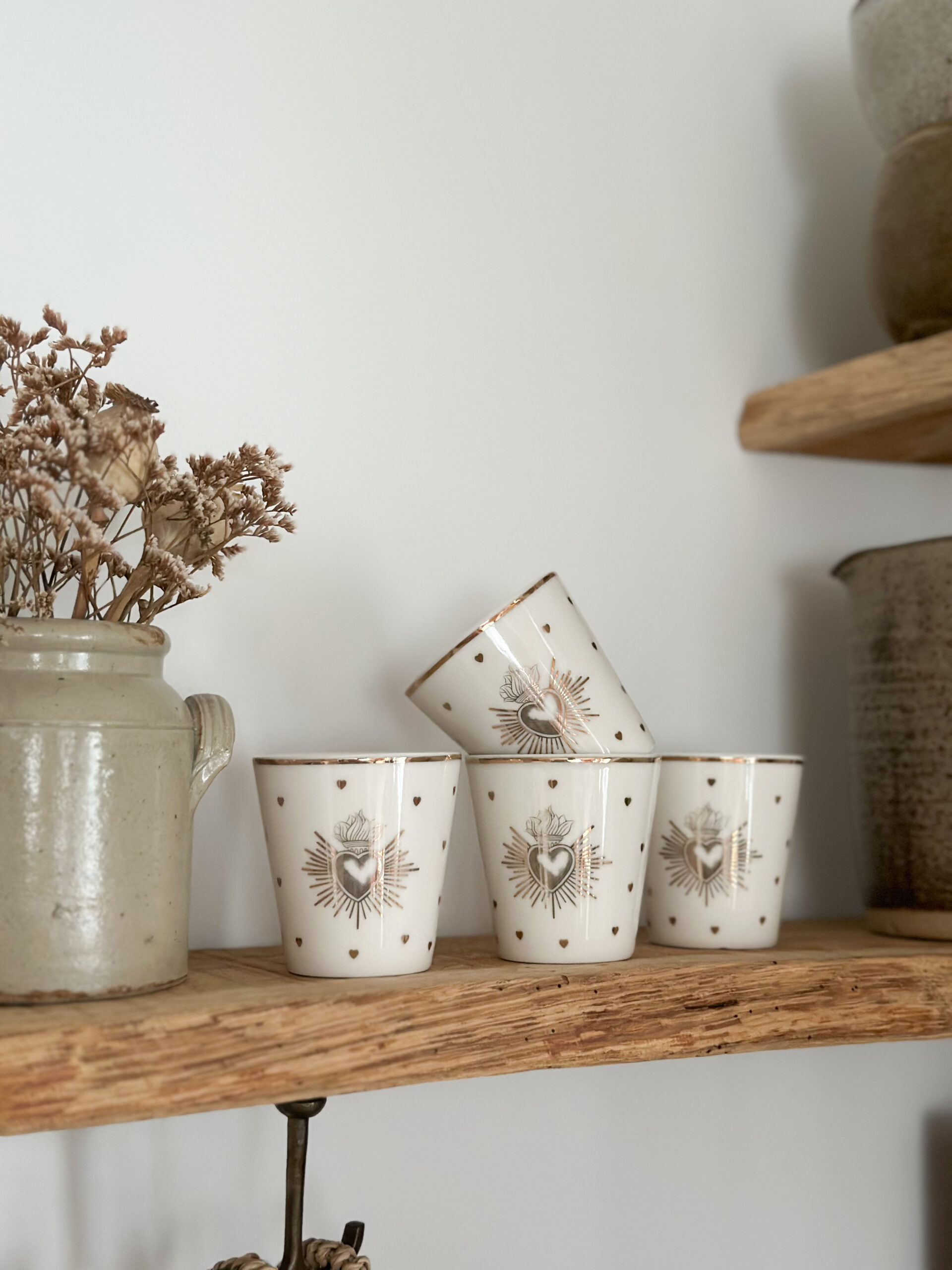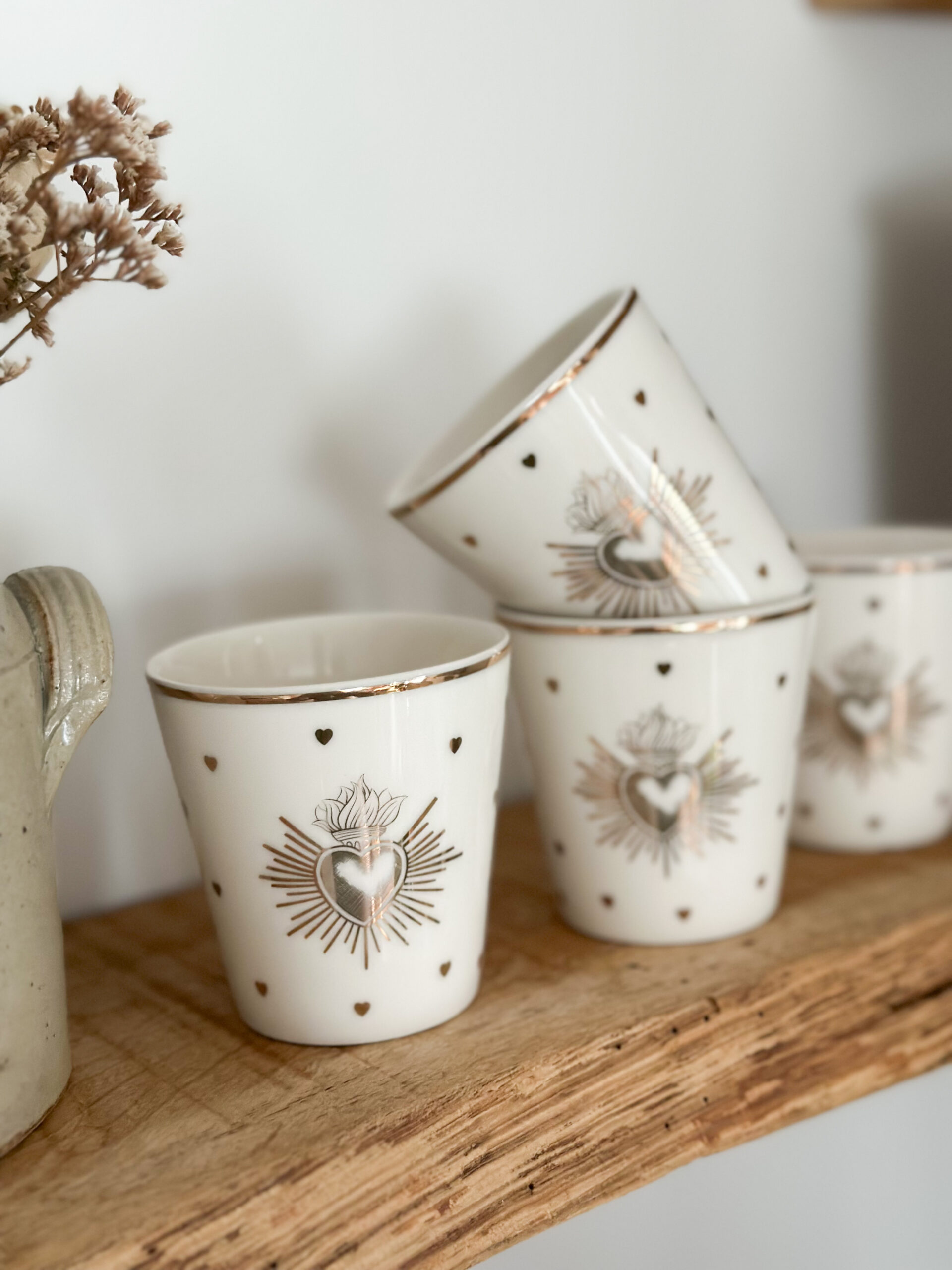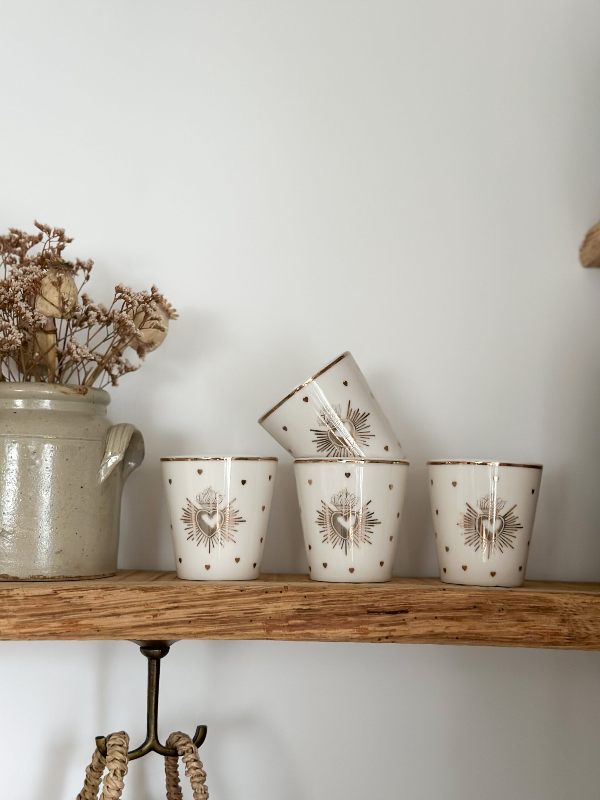 Joli gobelet Ex-Voto & petit coeur doré, idéal pour la pause café.