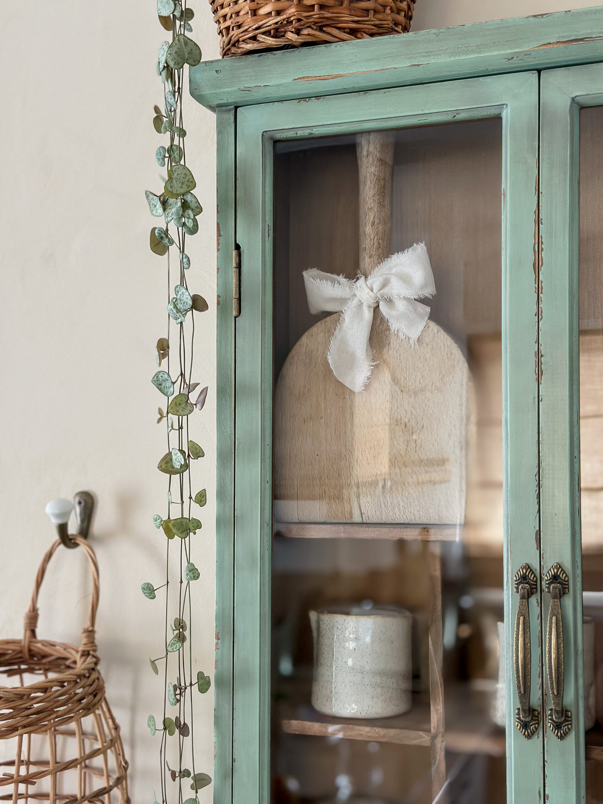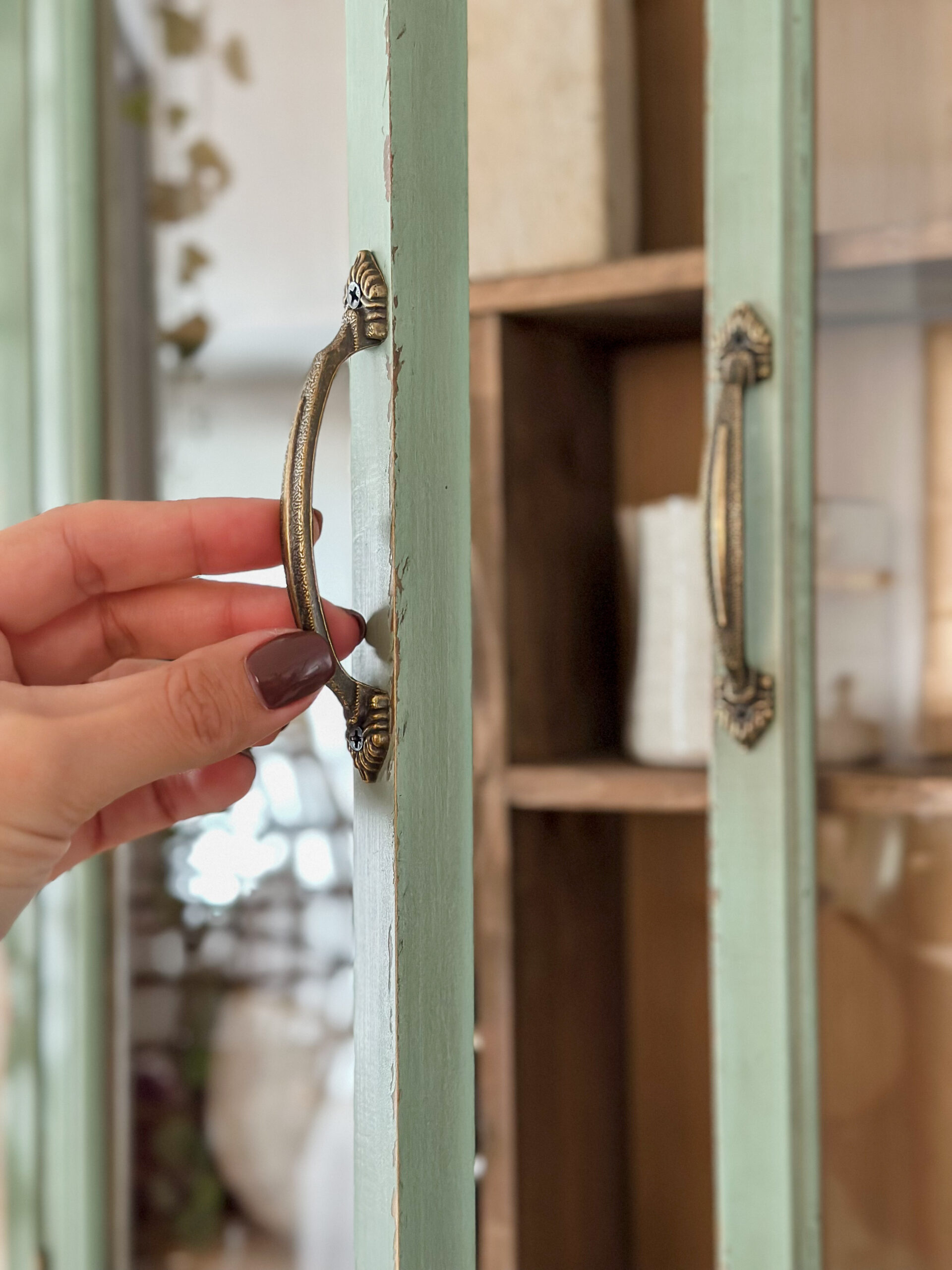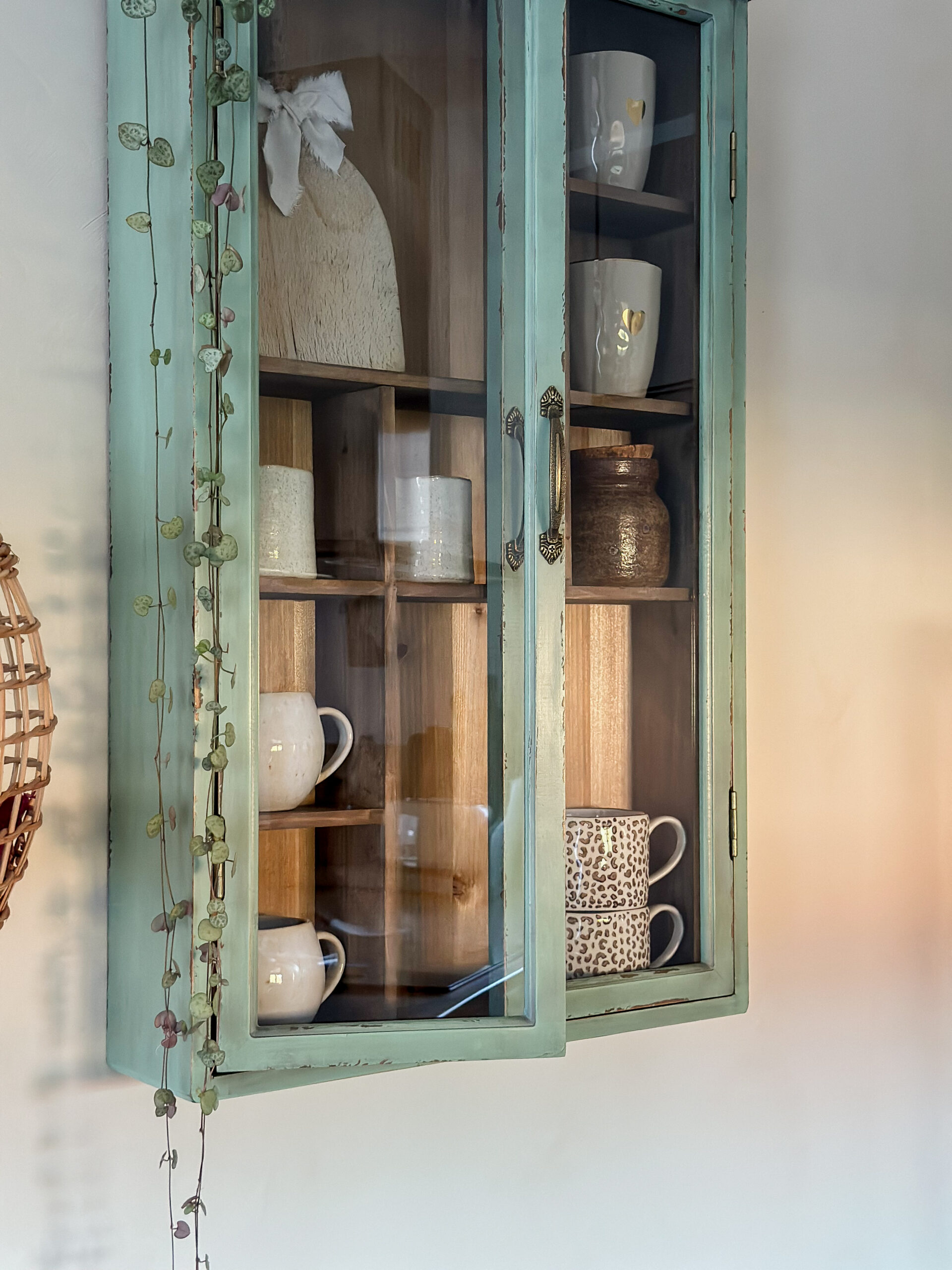 On craque pour le look vintage, chaleureux et champêtre de cette vitrine qui semble avoir été chinée sur une brocante. Tout a été pensé pour lui donner l’aspect d’un meuble ancien, hériter d’une histoire familiale : la peinture vert amande comme patinée par le temps, l’intérieur authentique en bois naturel et les jolies poignées rétro en métal vieilli. Ce meuble vous permettra de créer un cachet authentique et vintage dans votre cocon.