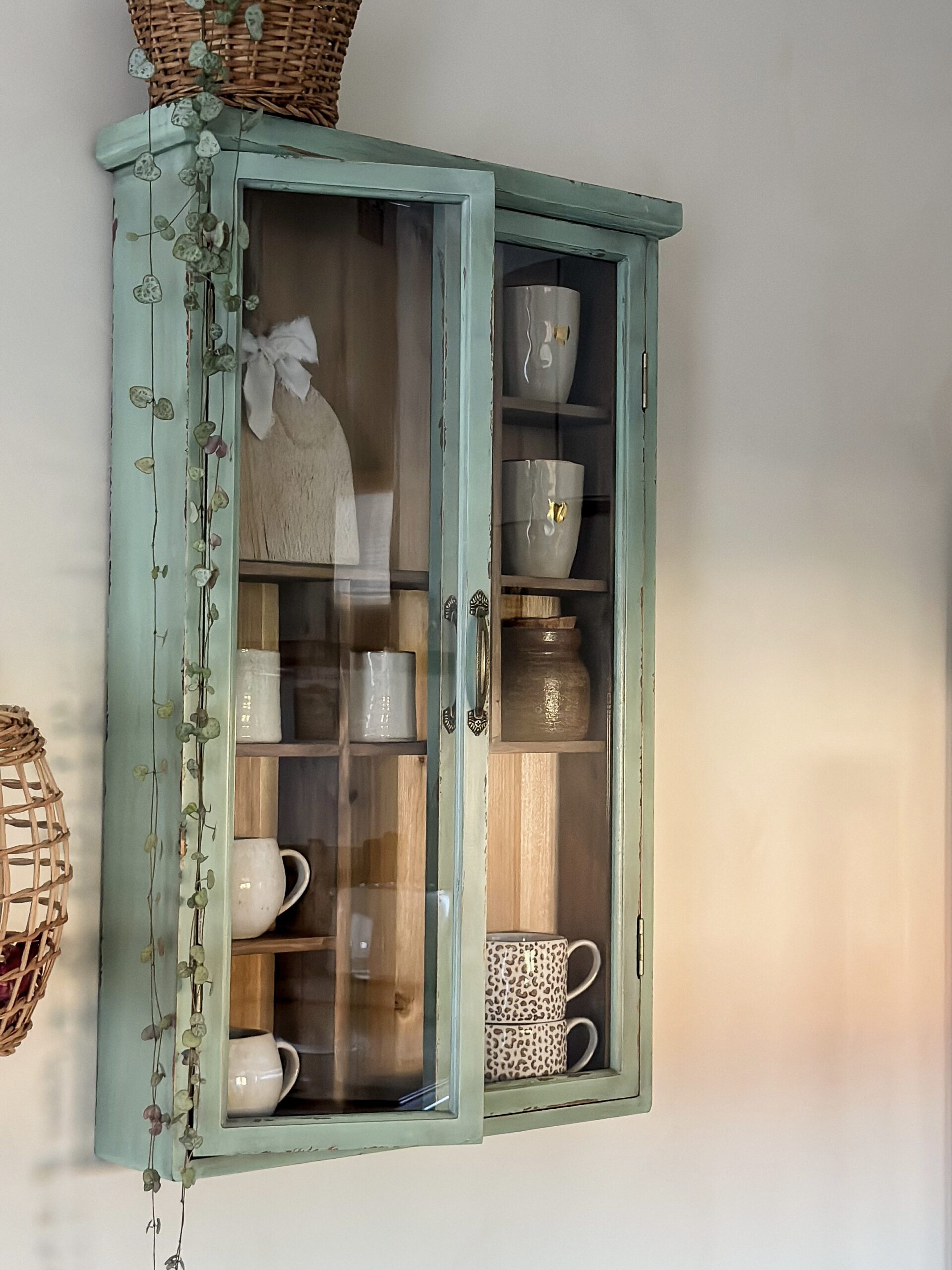 Vitrine en pin. Coloris vert amande. Elle est vendue sans fixation.