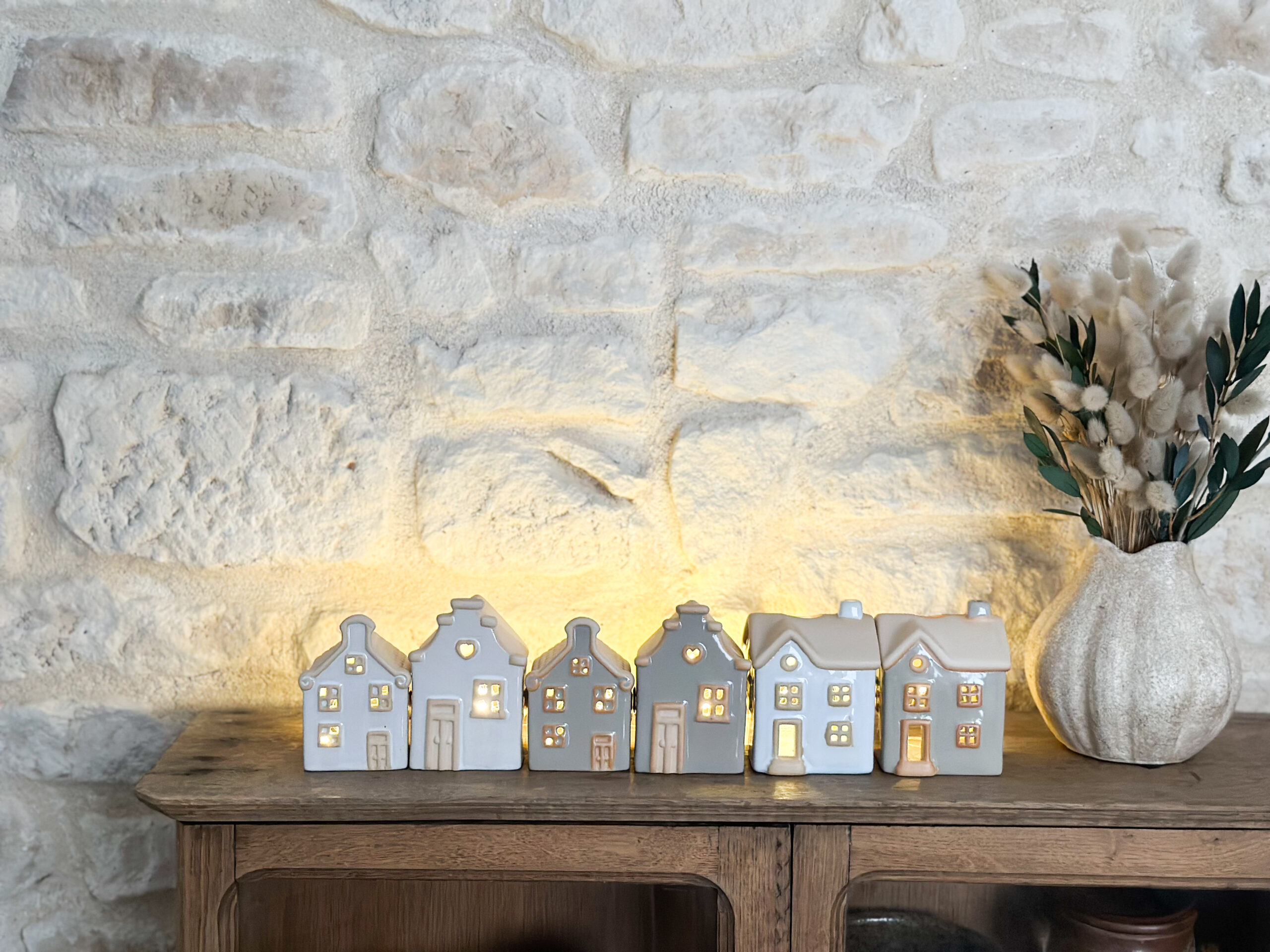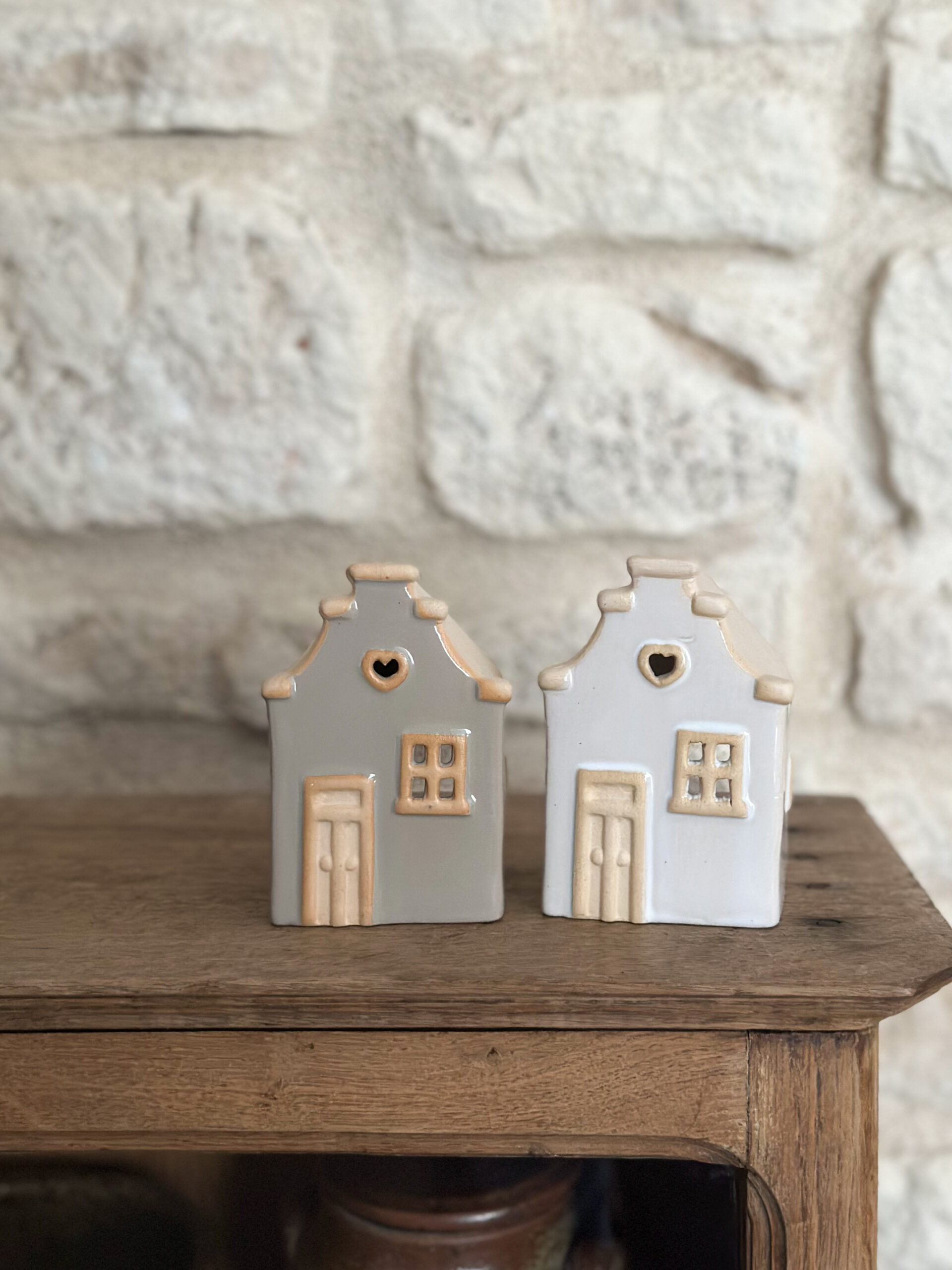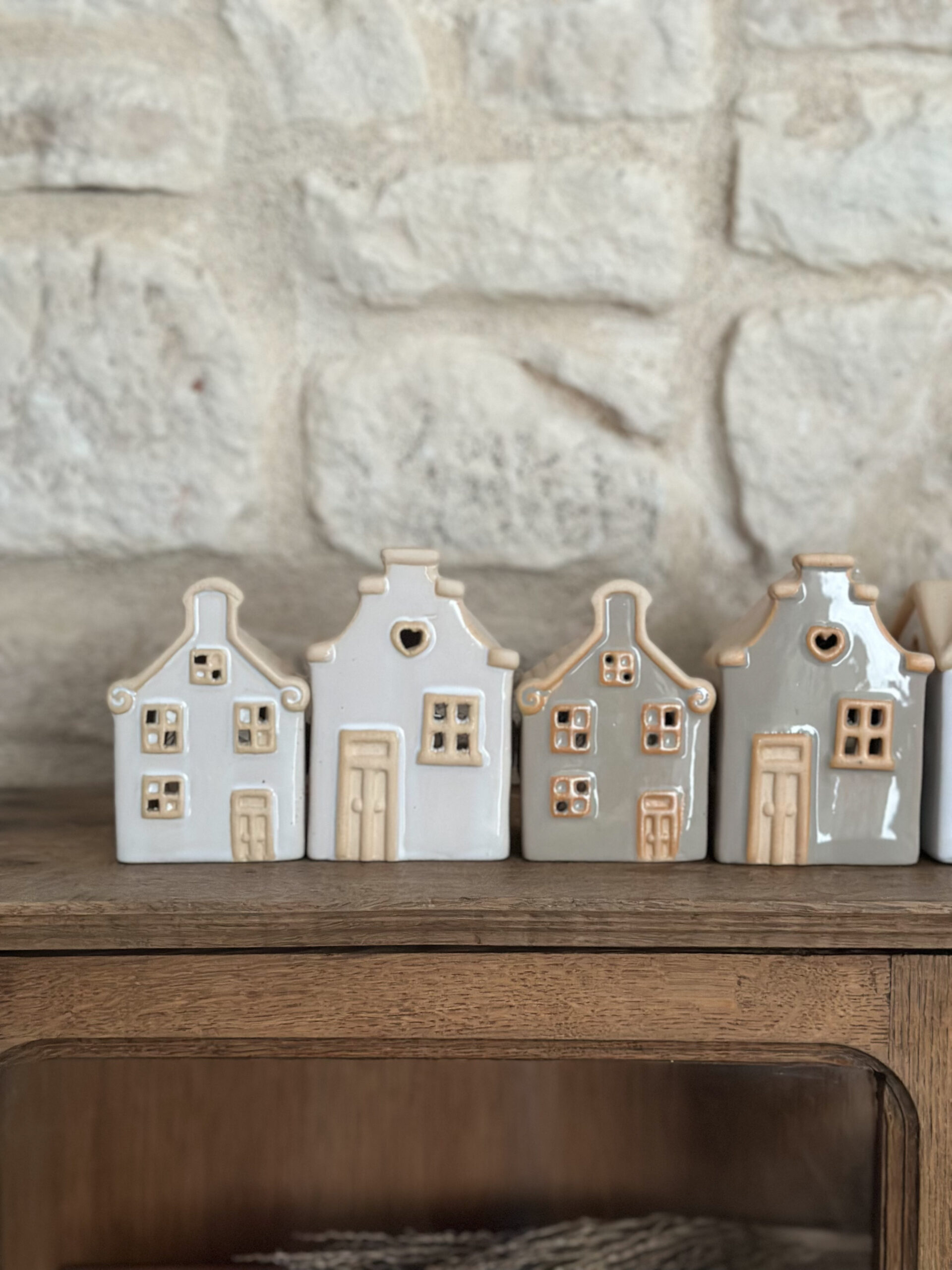 Jolies maisons photophore en céramique. Disponible en lin et/ou blanc.