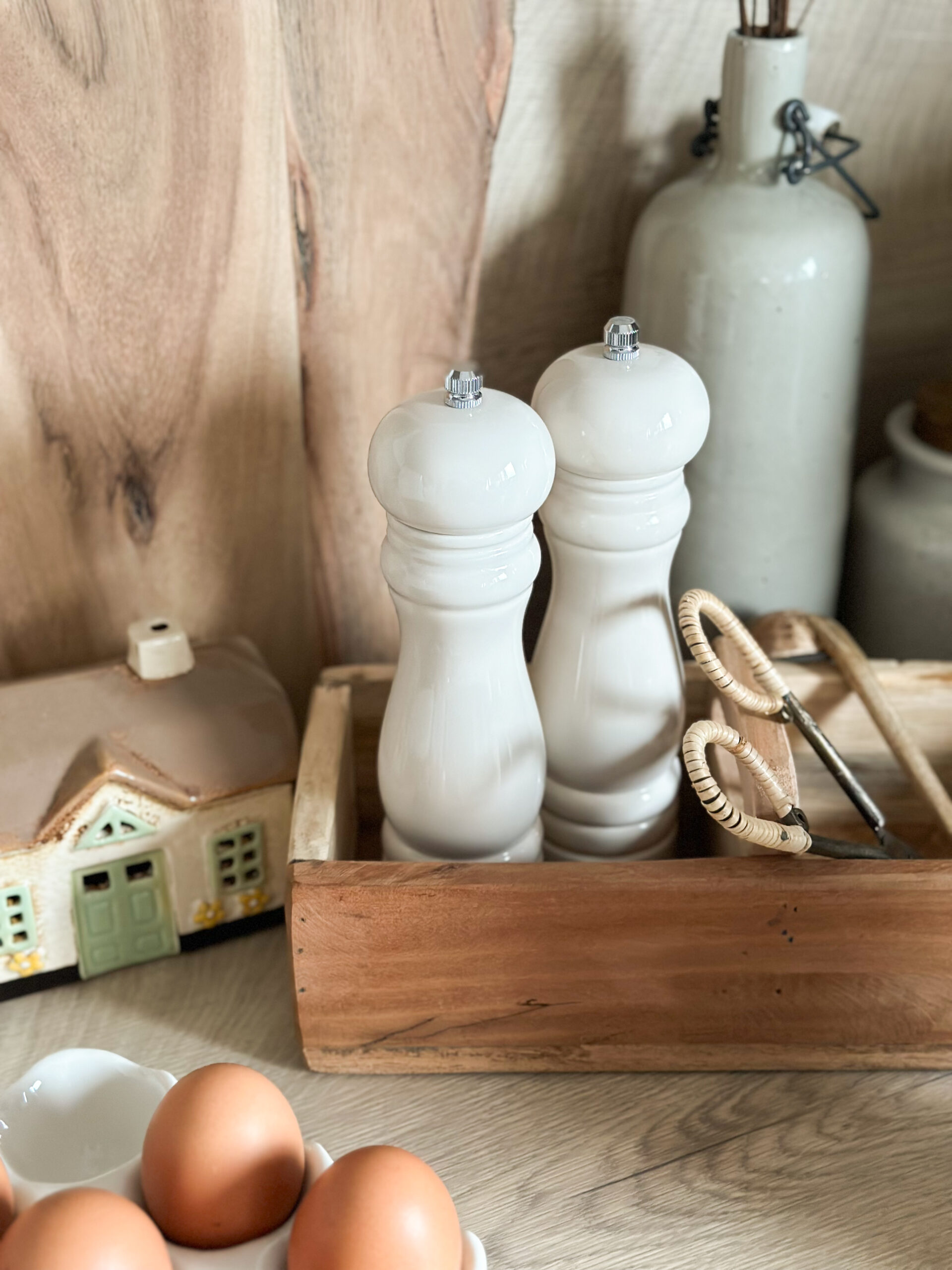Moulin à sel et à poivre élégant, coloris crème. Conçu pour compléter n’importe quel style et décor. L’ensemble laqué comprend des broyeurs en céramique qui assurent un excellent processus de broyage et fournissent un produit durable.
