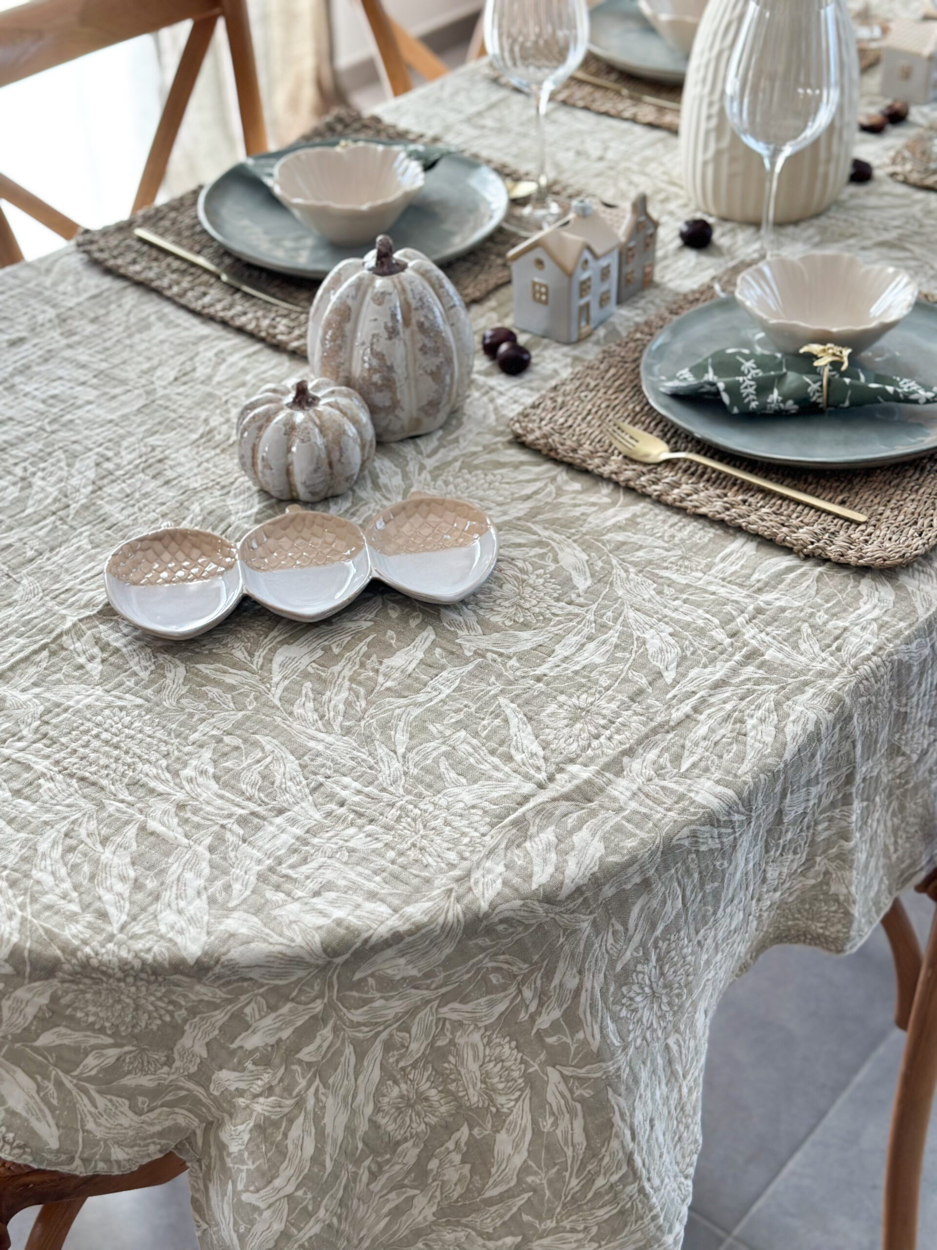 Coup de coeur pour cette magnifique nappe en coton gaufré. Un très bel imprimé avec des feuilles et des fleurs ivoire et beige.
