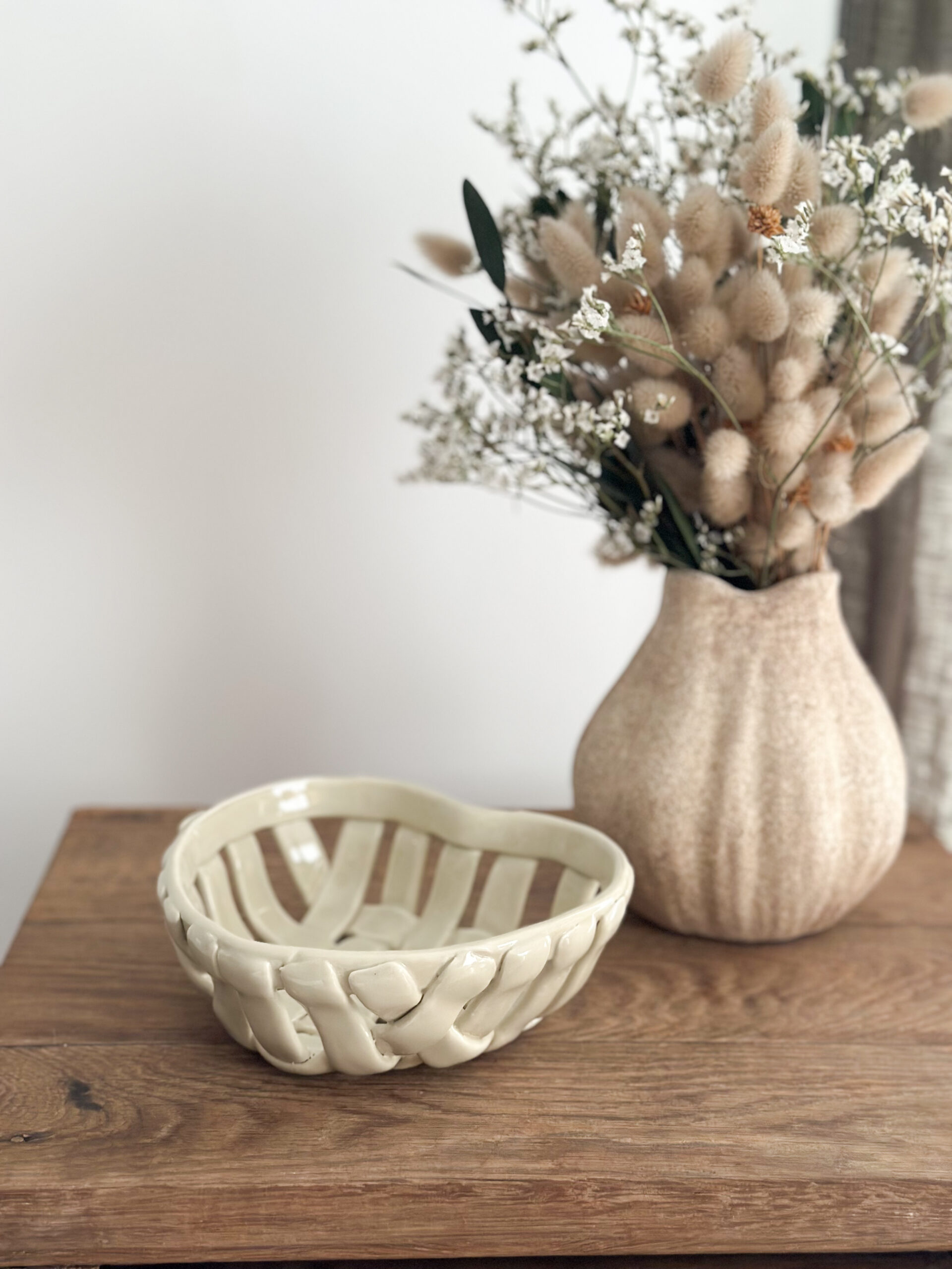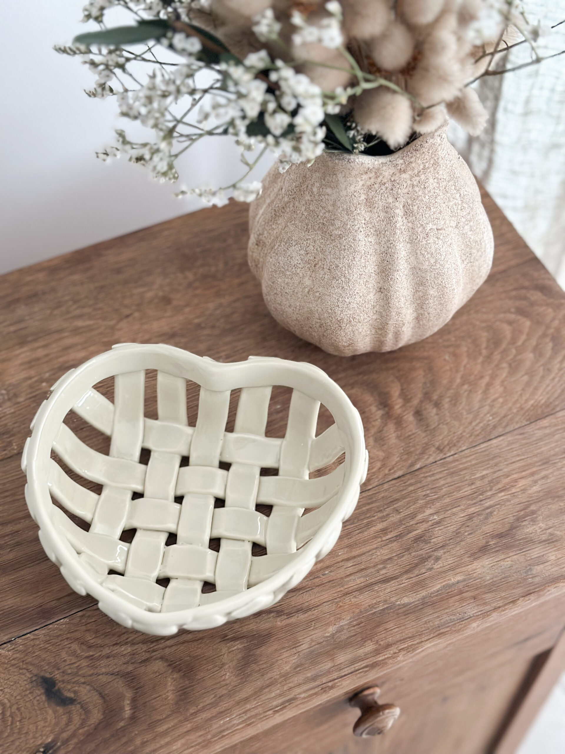 Jolie corbeille en céramique, en forme de coeur blanche.