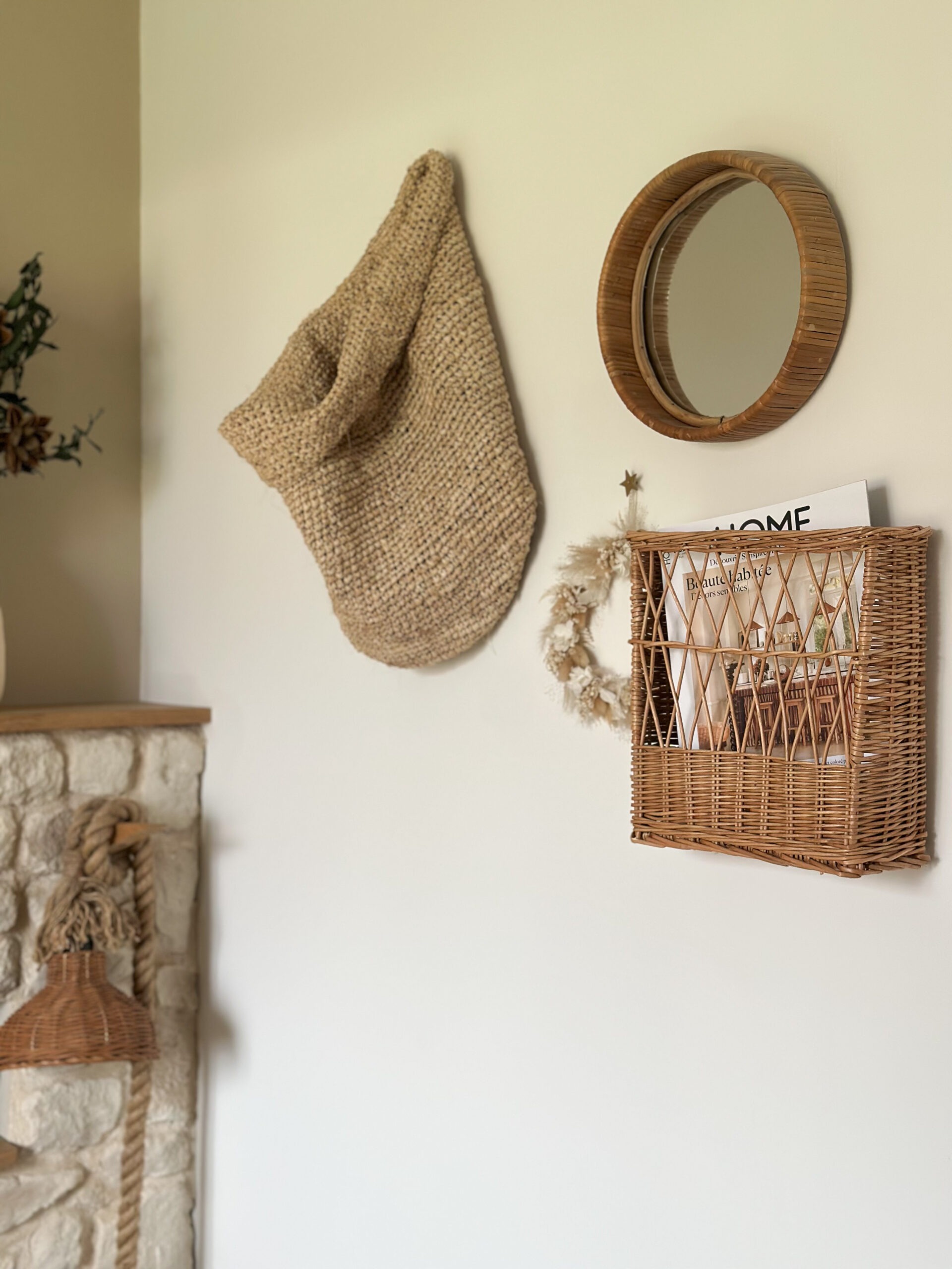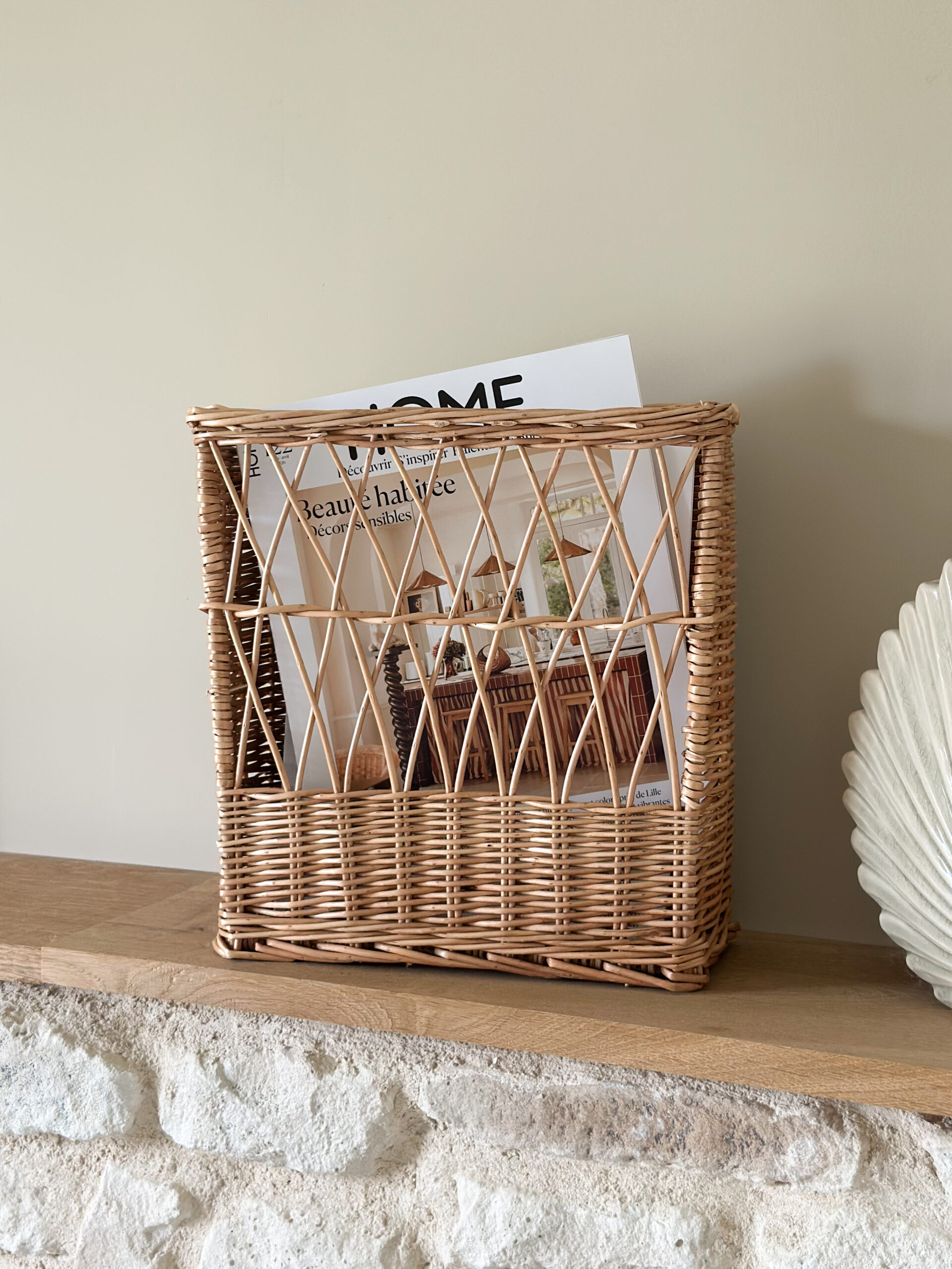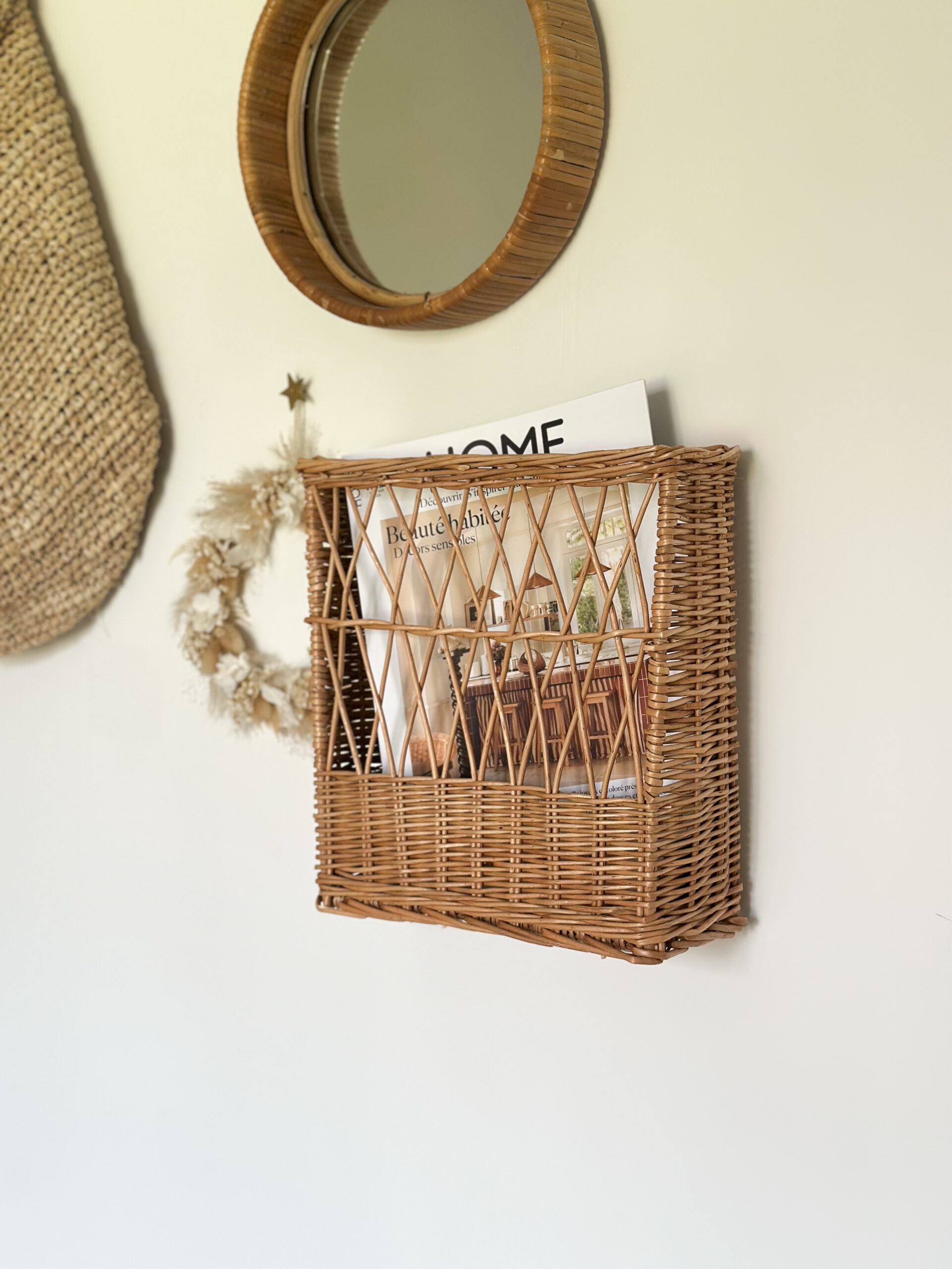 Un panier mural tressé en rotin, parfait pour y ranger vos livres / magazines du moment.