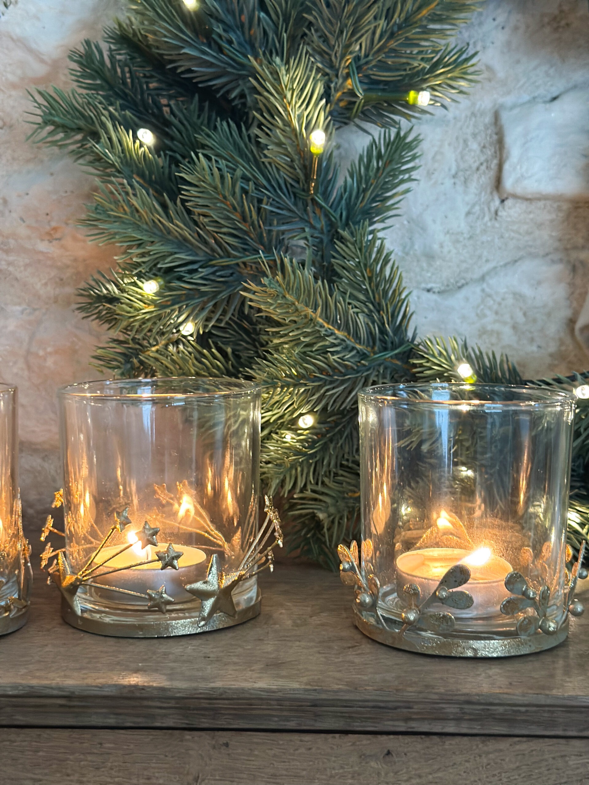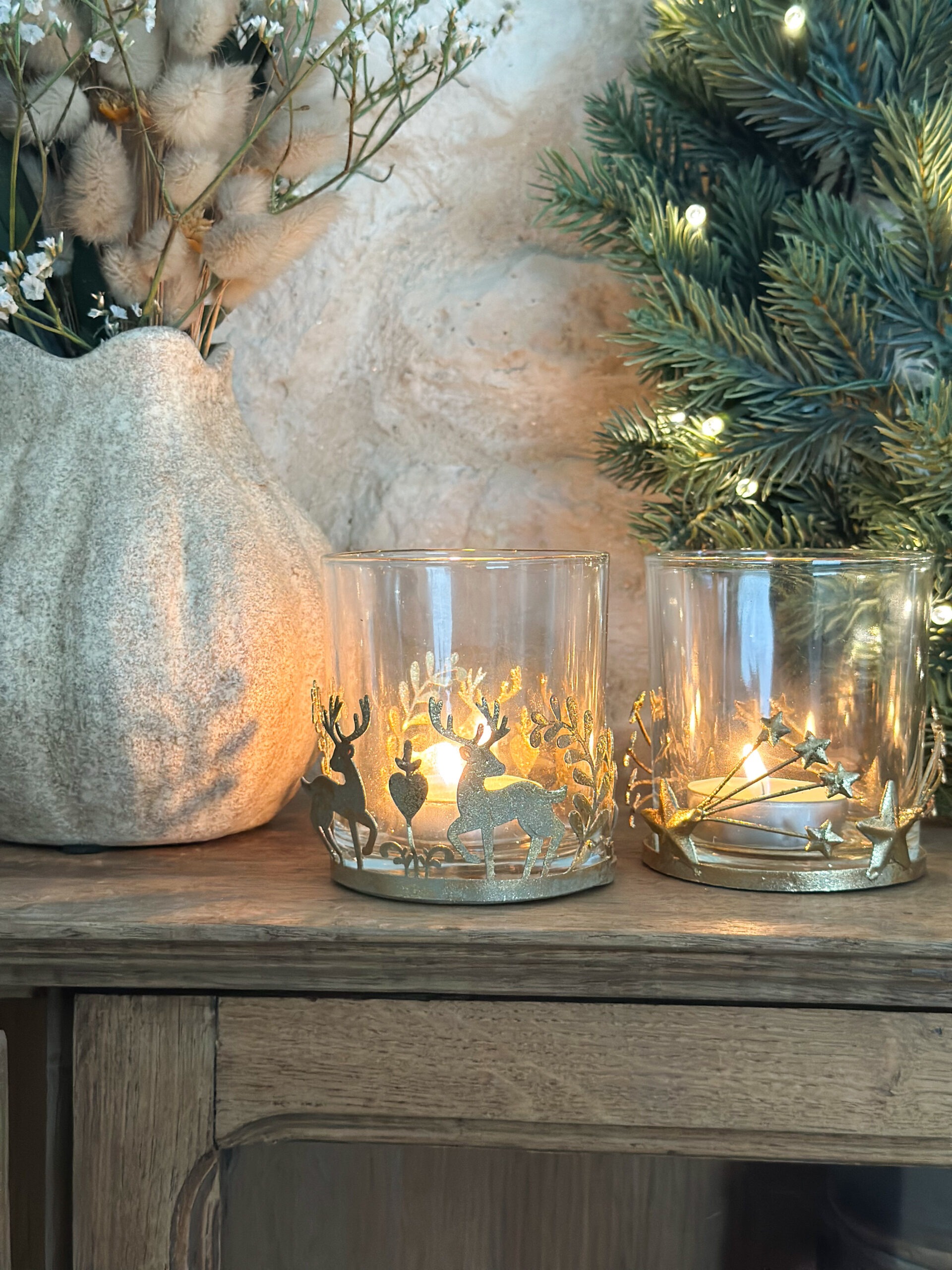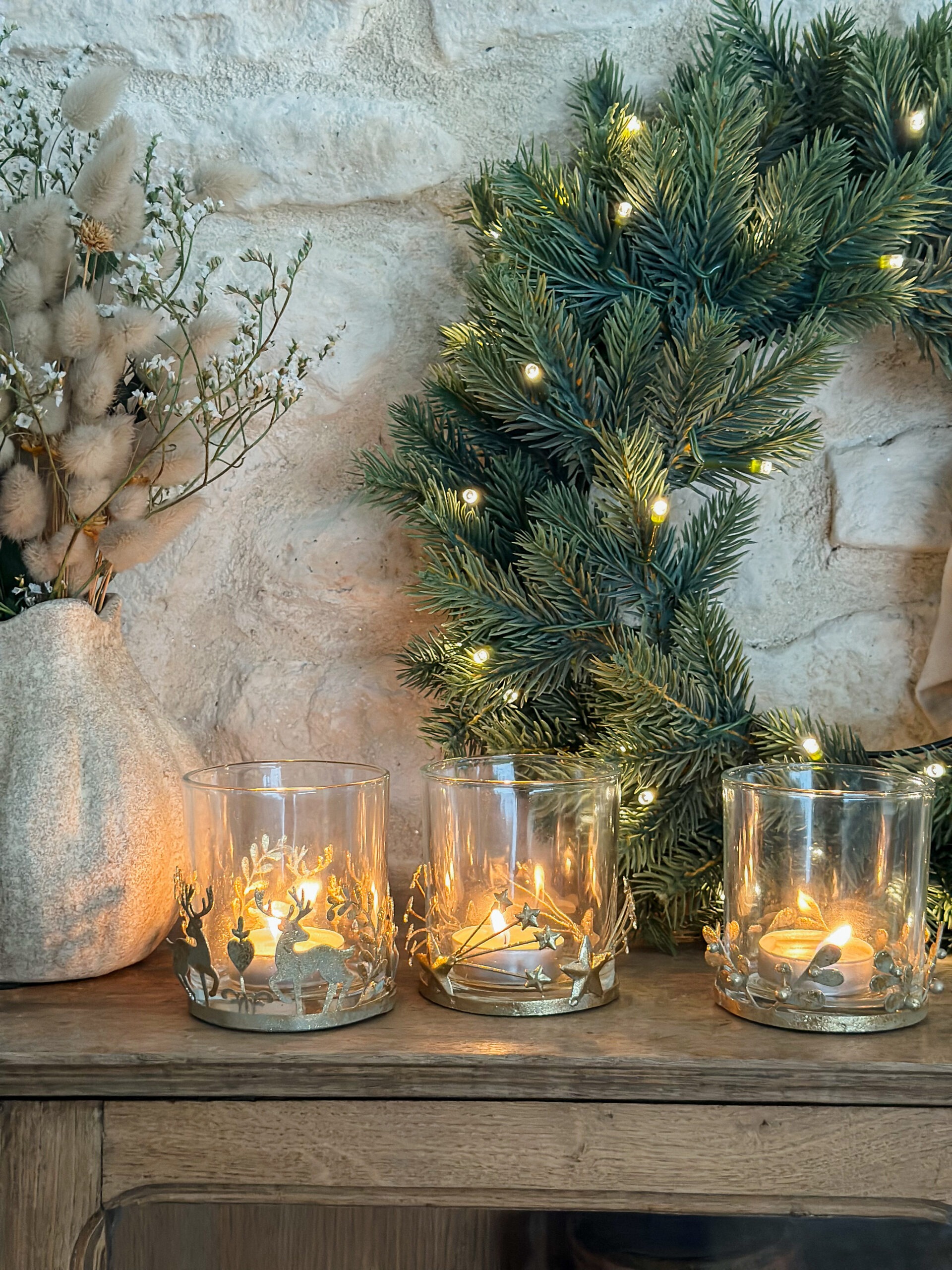 Photophores de Noël en verre avec décorations dorées festives. Ils s’intègrent facilement dans tous les styles de déco.