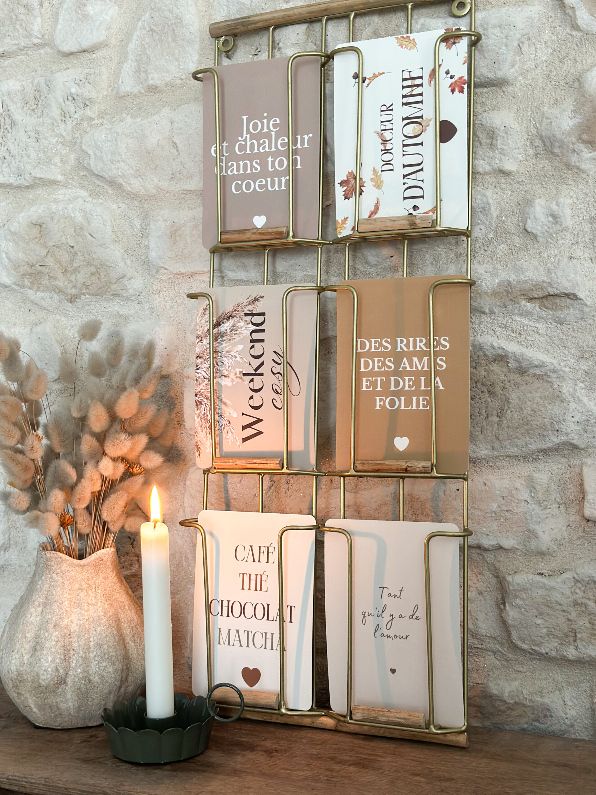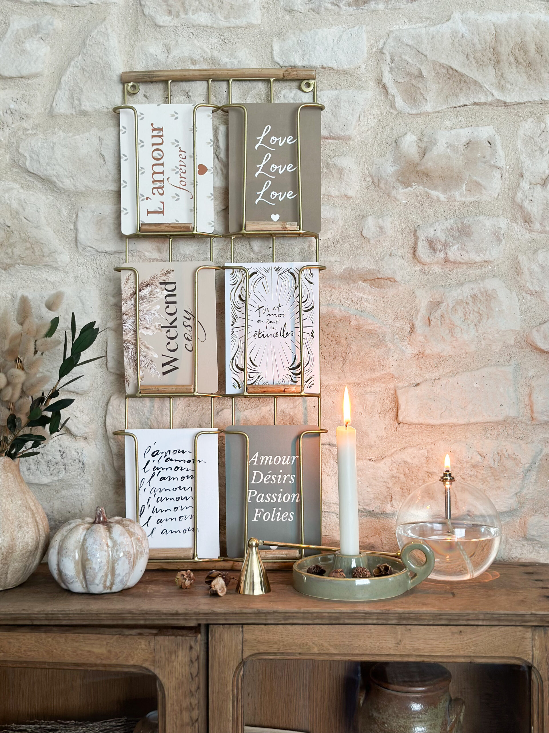 On craque pour ce porte-carte mural. Un objet de déco original pour mettre en valeur vos plus beaux souvenirs, photographies, cartes, illustrations. Son format est facile à intégrer dans votre décoration. Il comprend 6 places et offre une jolie variante aux traditionnels cadres.