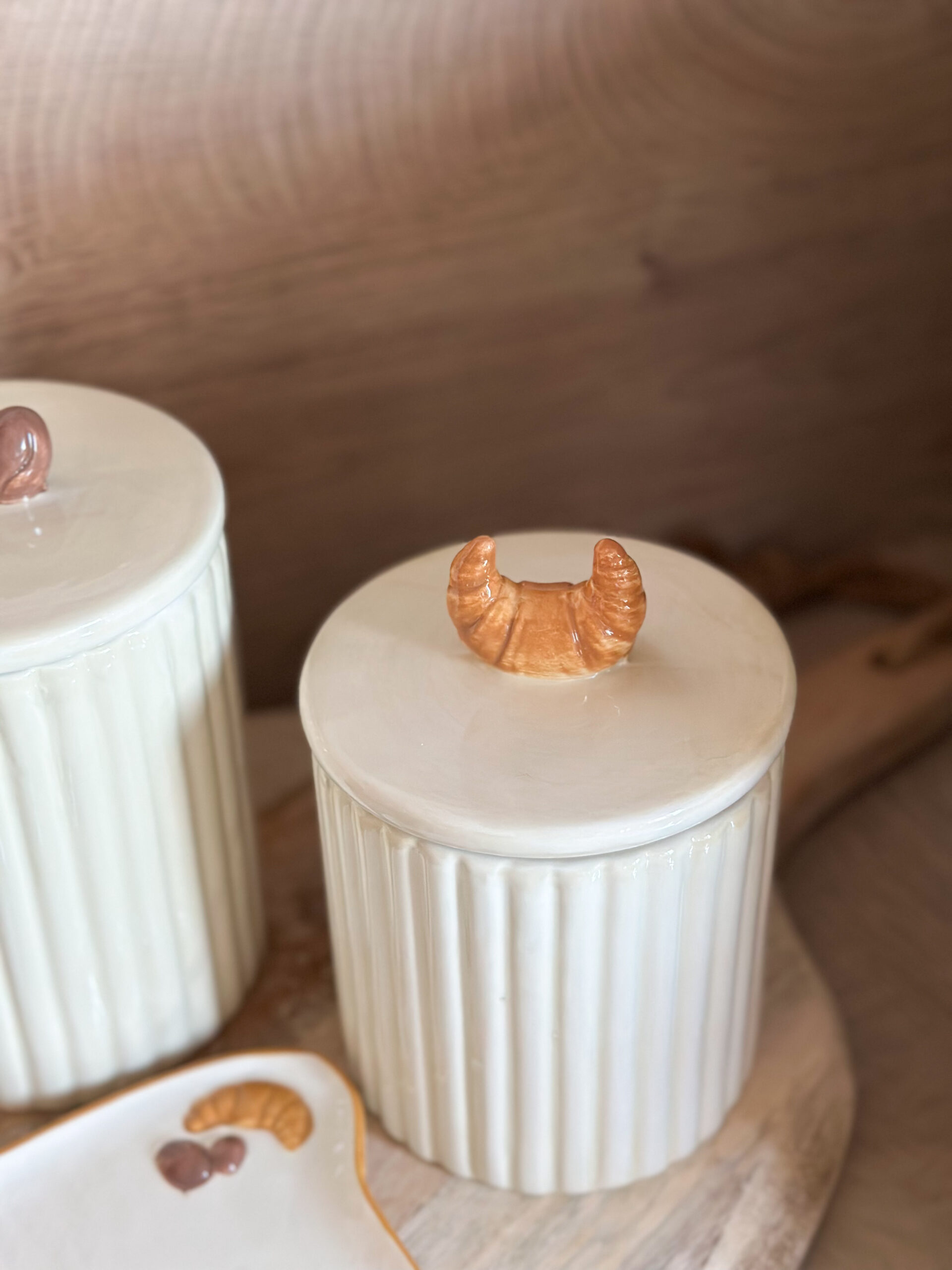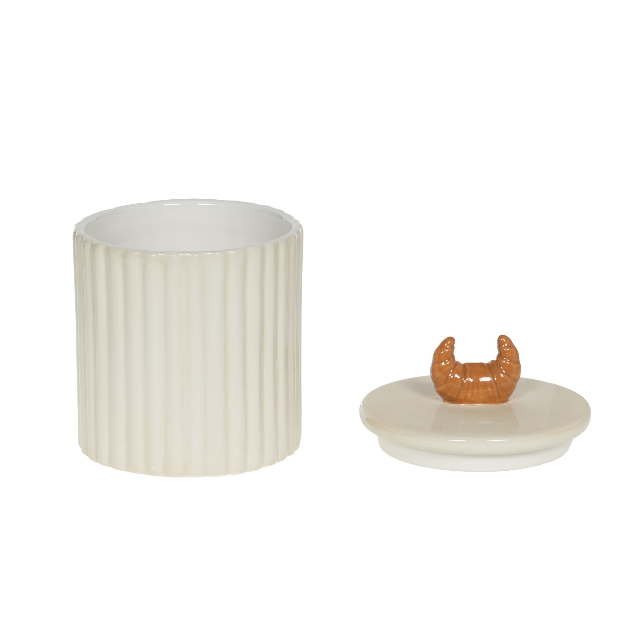 Apportez une touche douce et raffinée à votre cuisine avec ce pot petit-déjeuner en céramique. Son corps cannelé couleur crème et son couvercle orné d’une petite poignée en forme de croissant apportent charme et fonctionnalité pour conserver café, sucre ou biscuits.