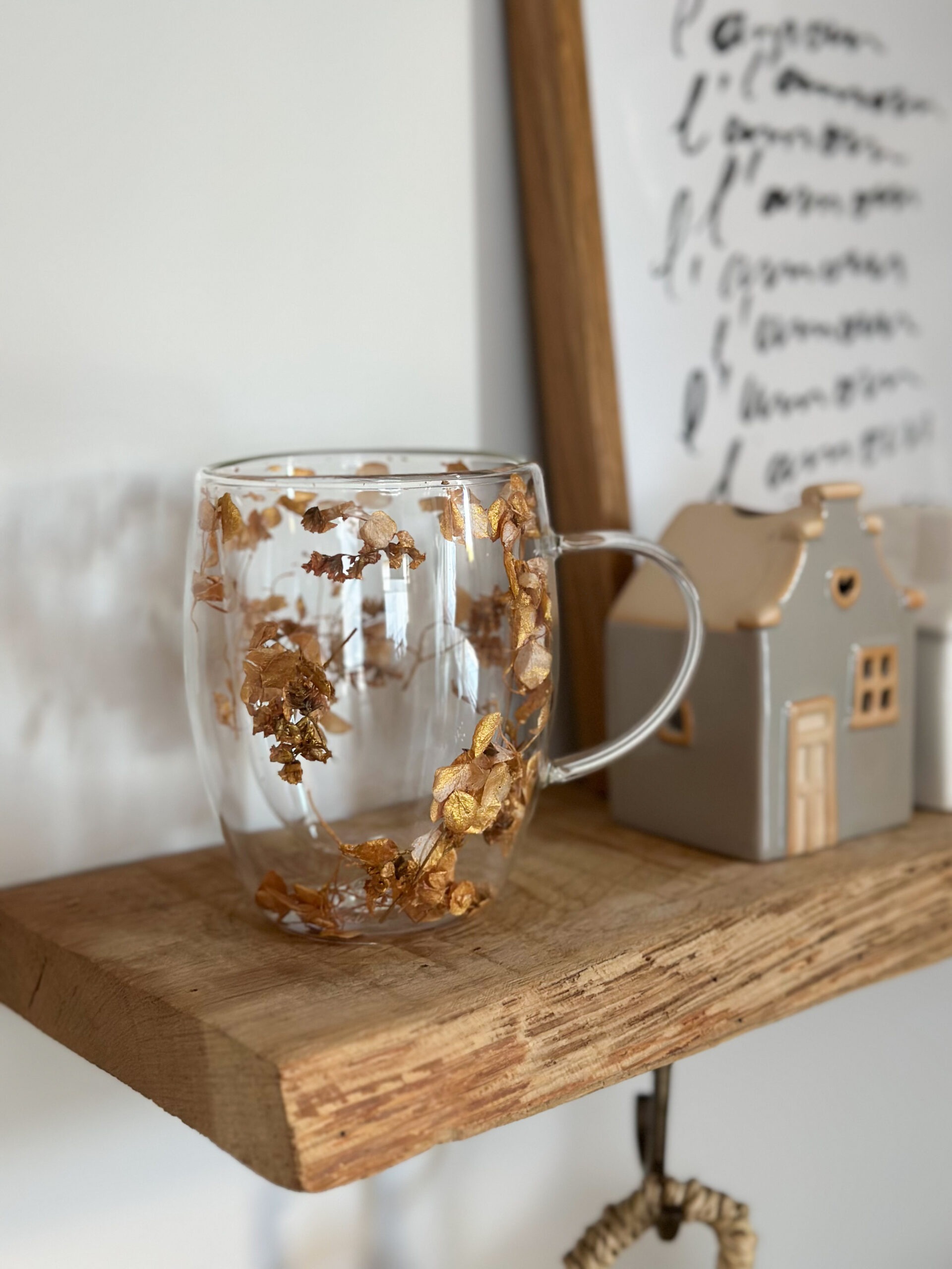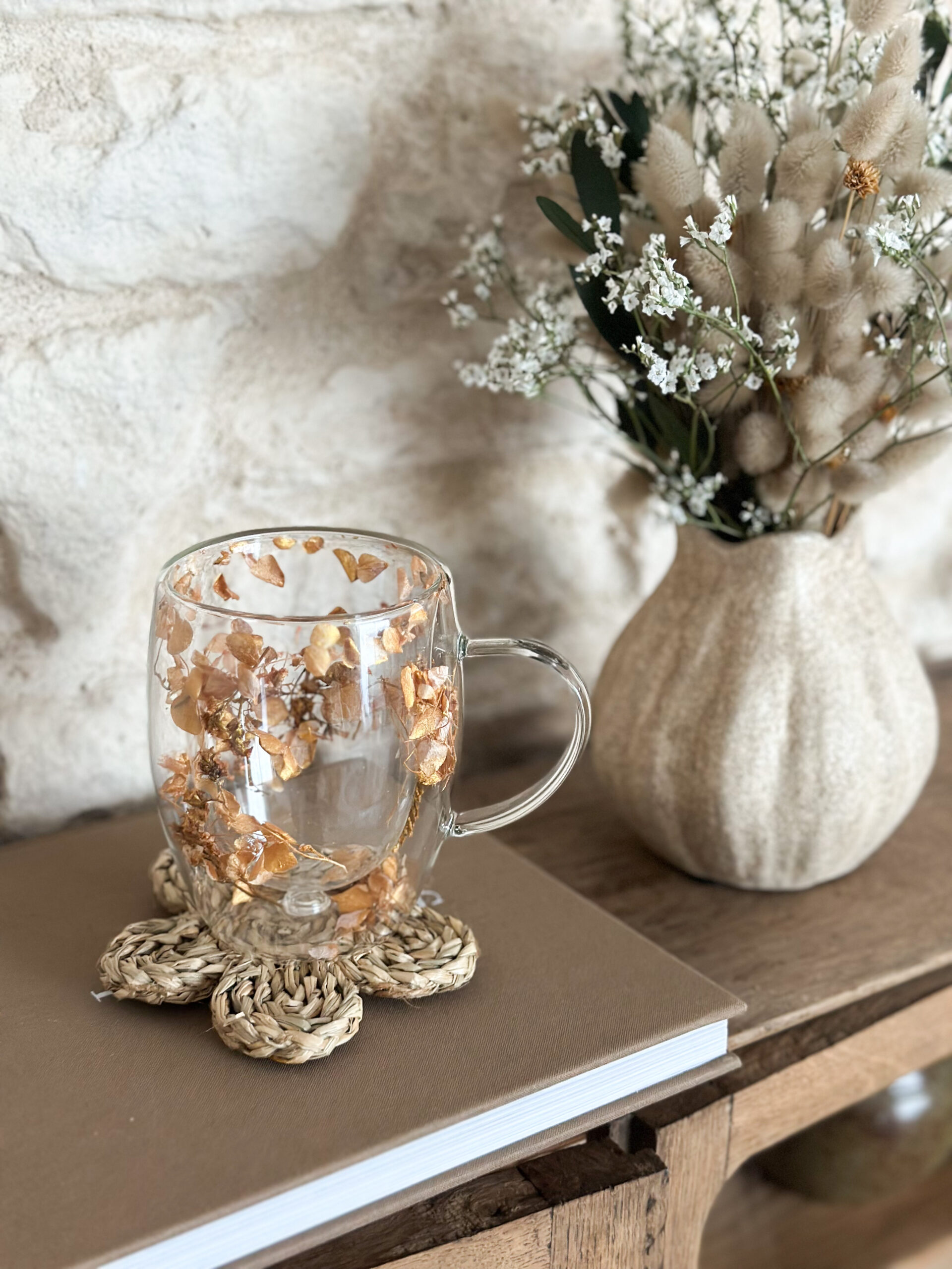 Laissez vous séduire par l’élégance florale de cette magnifique tasse en verre double paroi.