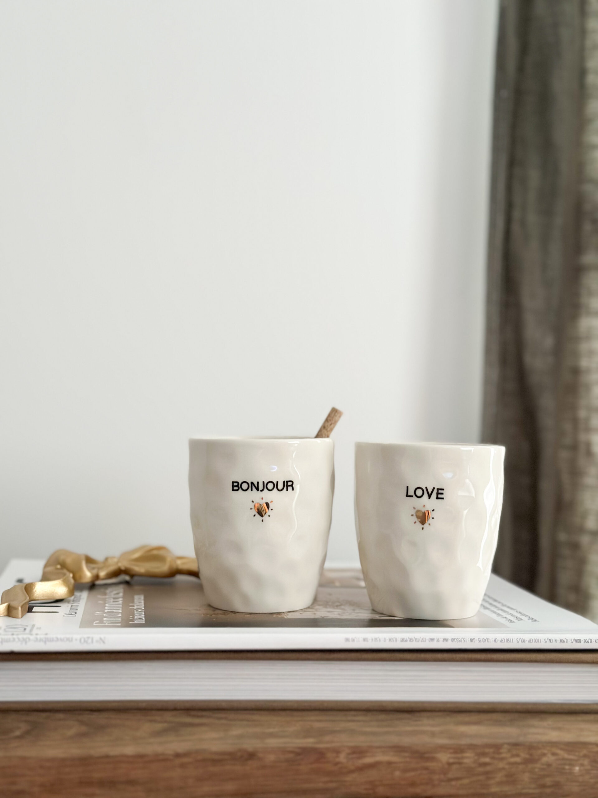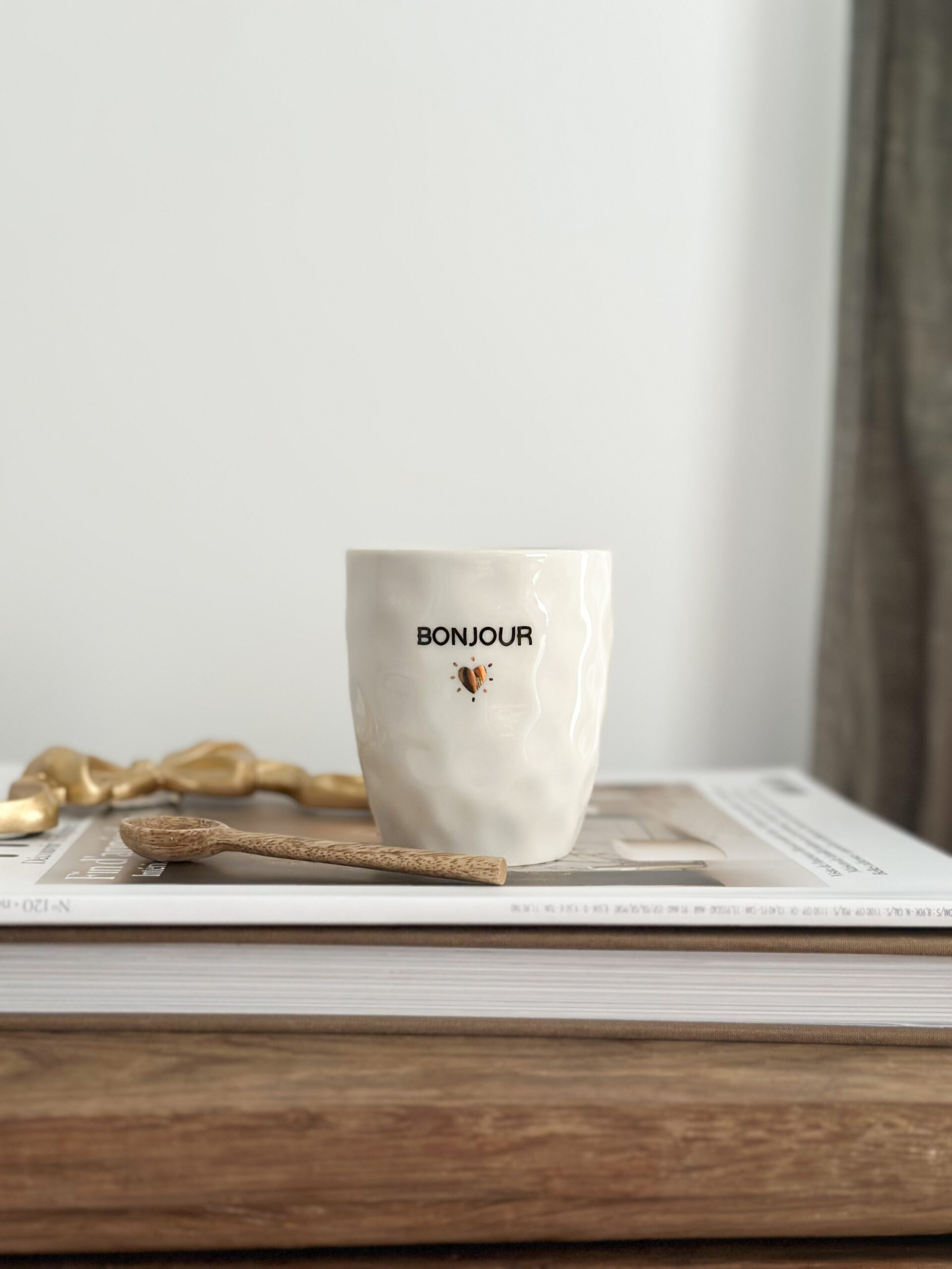 Apportez une note douce et lumineuse à vos pauses avec cette tasse “bonjour”, ornée d’un cœur doré à effet martelé. Son design délicat et raffiné en fait un bel objet du quotidien, parfait pour sublimer une table ou offrir un cadeau plein de charme.