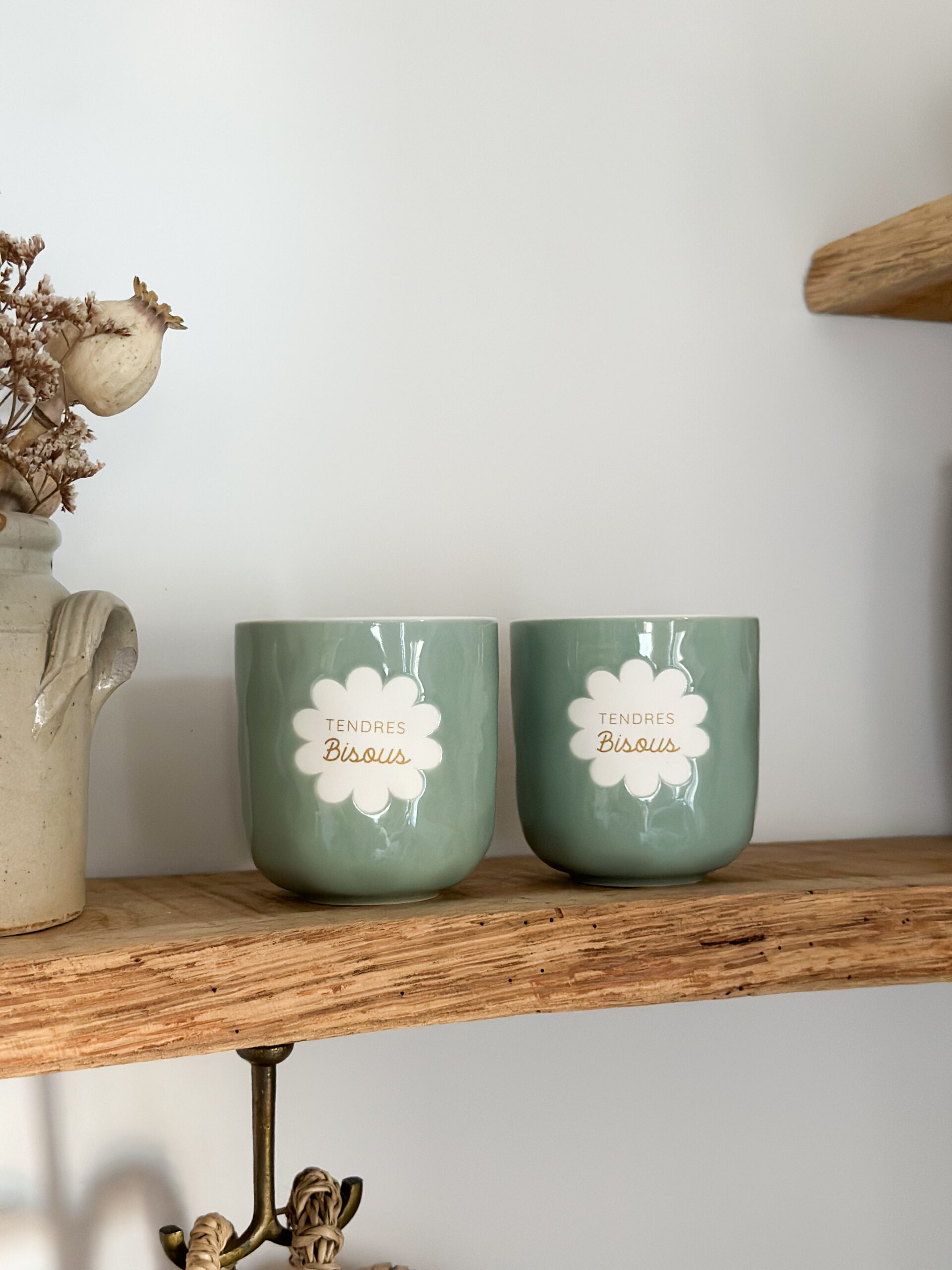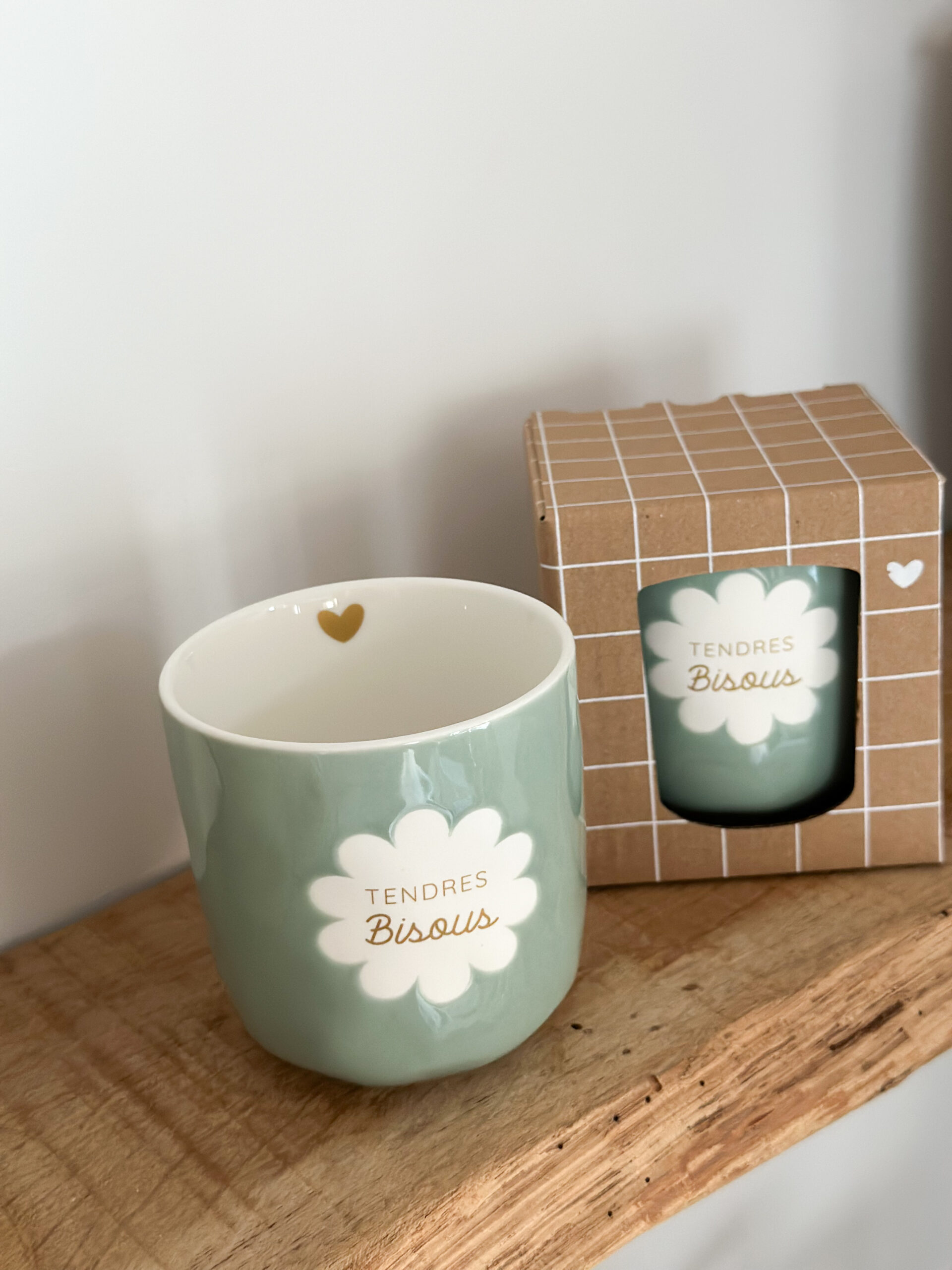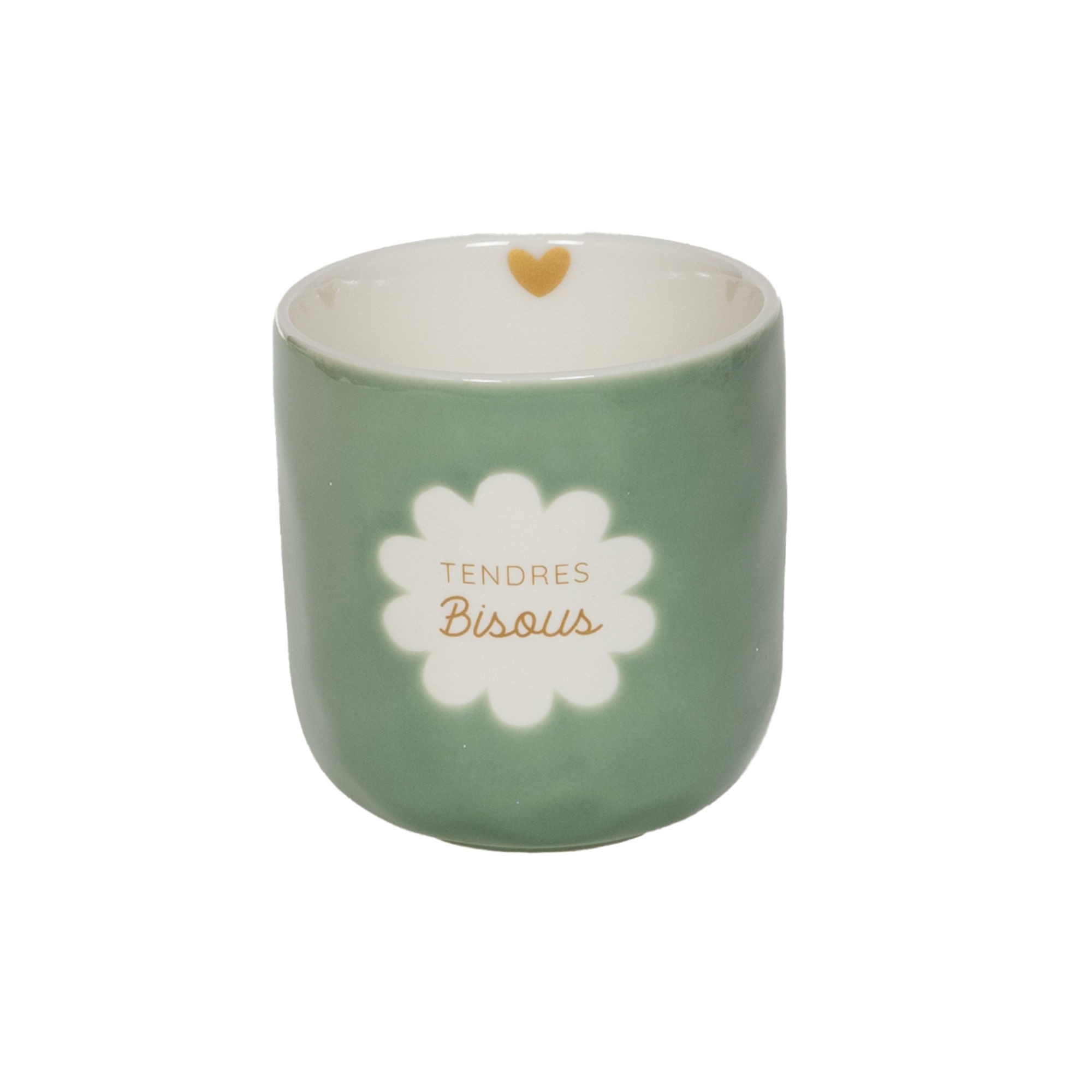 Adoptez un rituel tout en douceur avec la tasse « Tendres Bisous ». En porcelaine au fini vert poudré, elle affiche un motif floral et un lettrage doré qui apportent chaleur et poésie à vos pauses café ou thé.