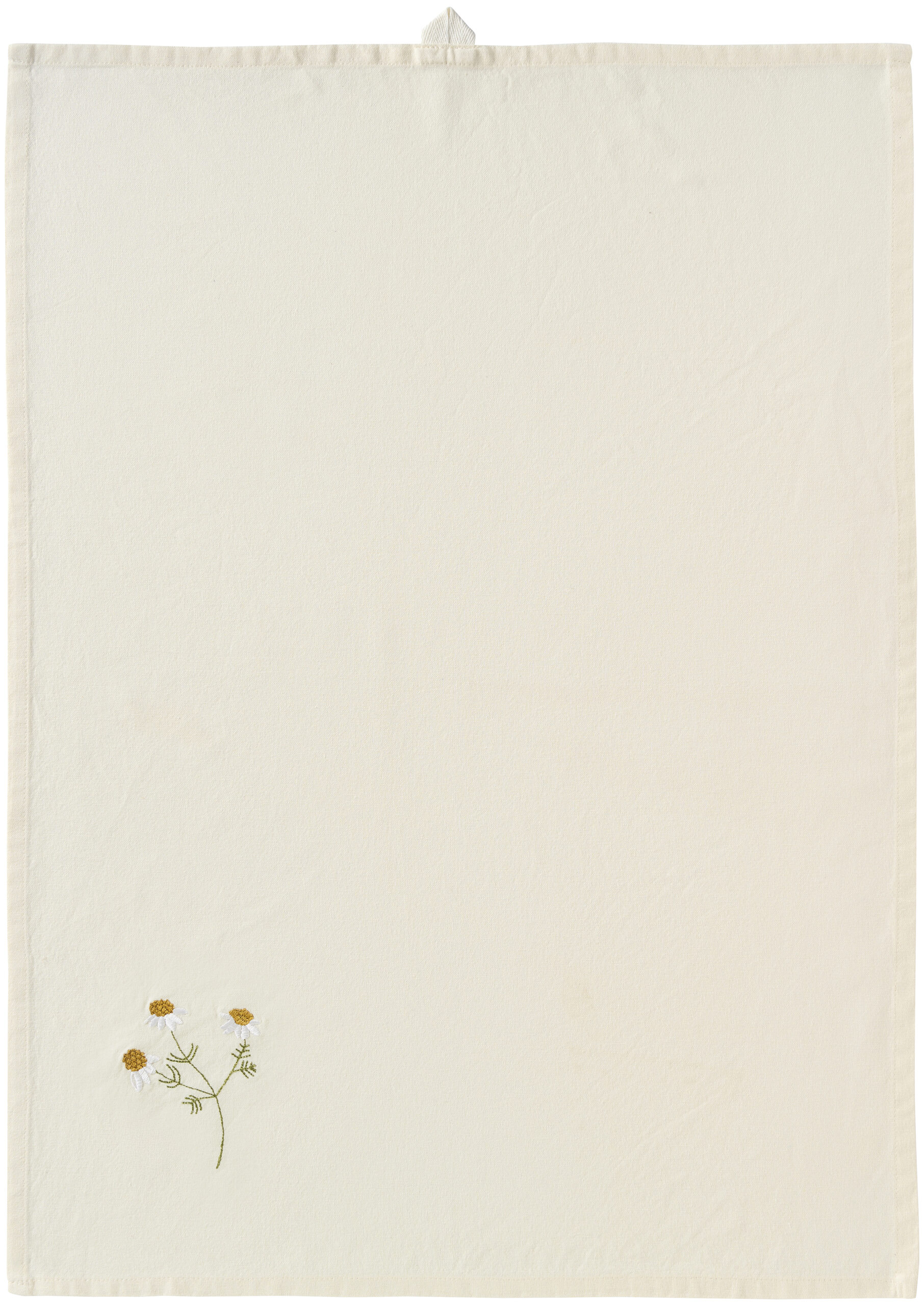 Joli torchon en coton coloris beige clair avec une broderie de marguerites.